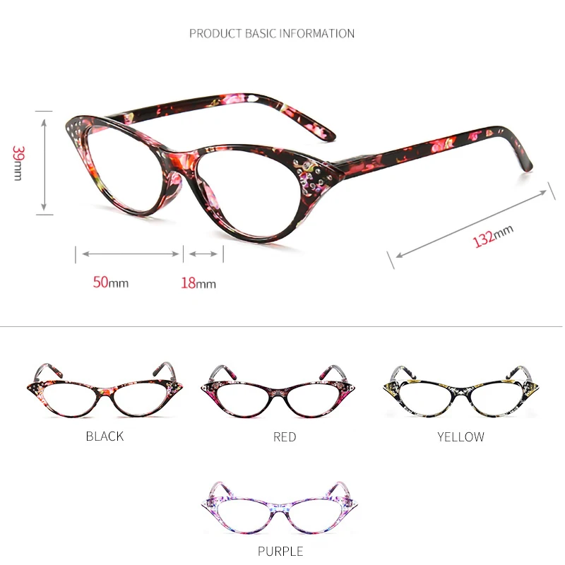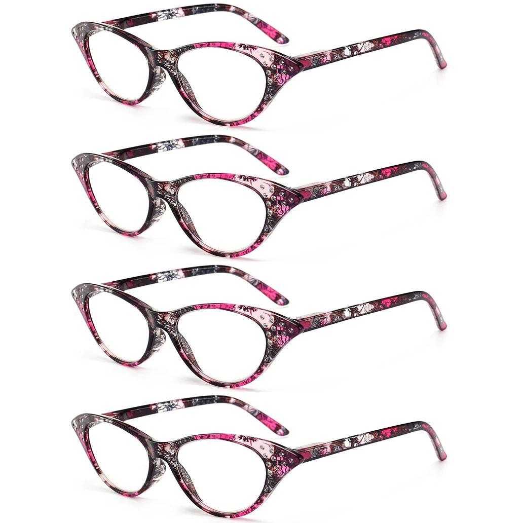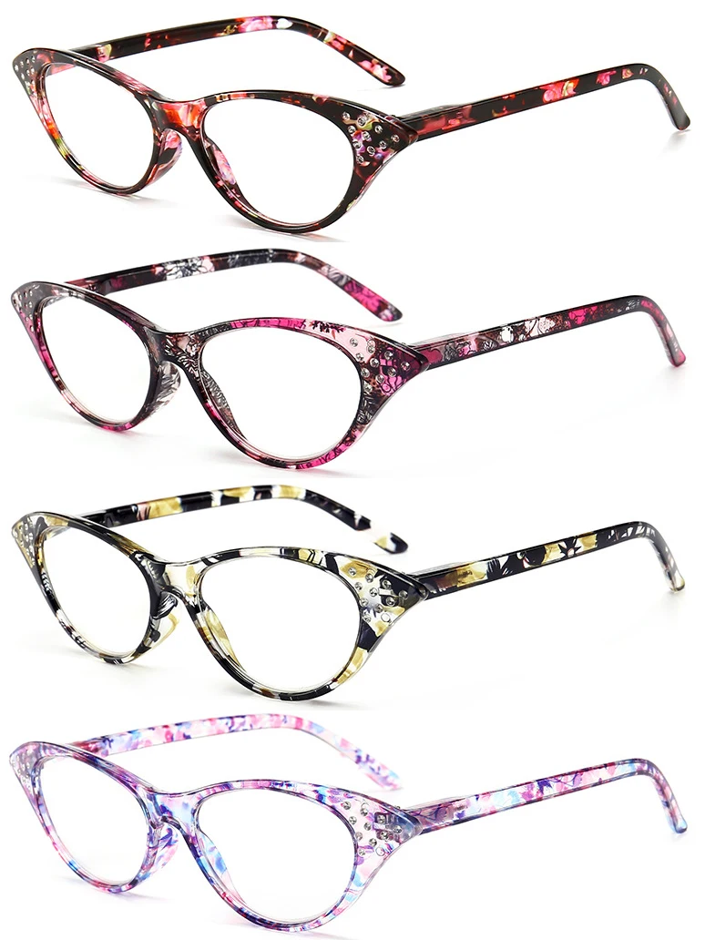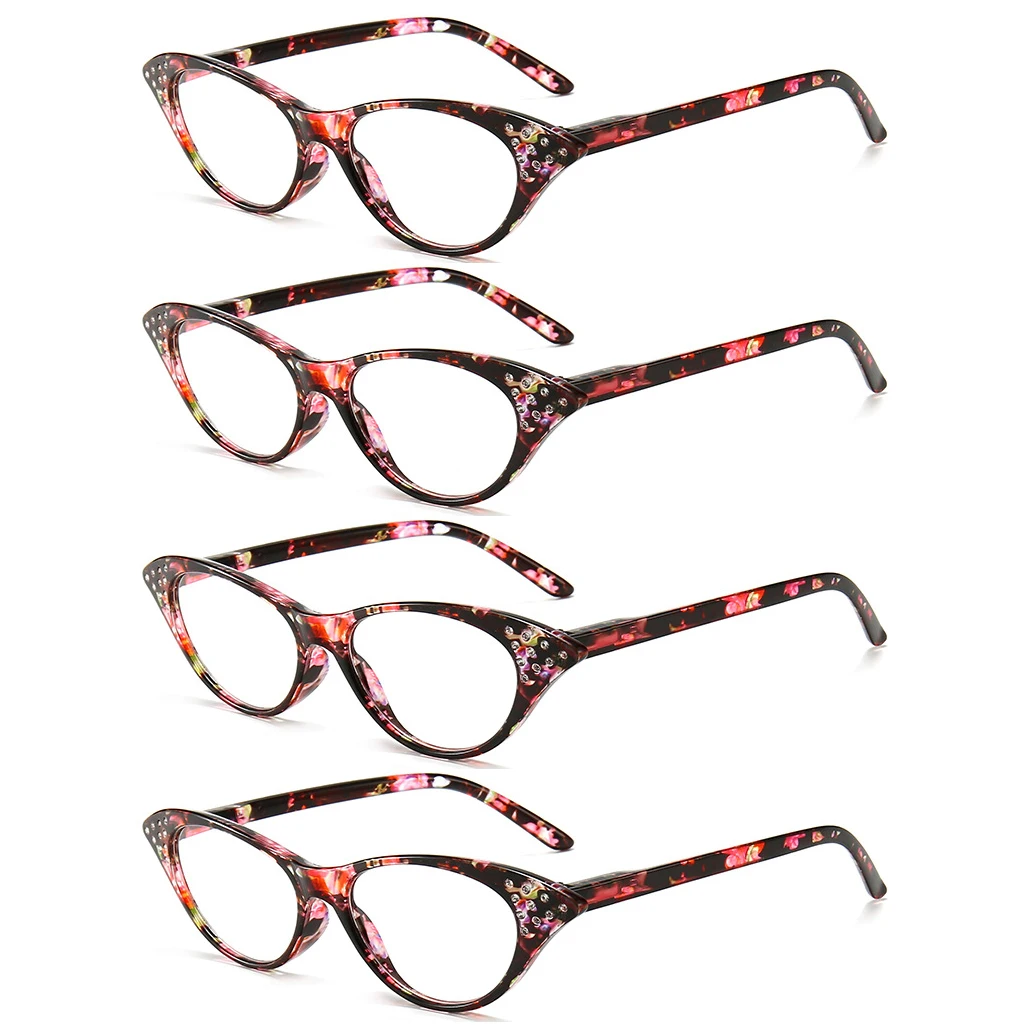 4 пары очков для чтения в оправе кошачий глаз с такой же силой увеличения для всех 4 пар. Храните одну пару в каждой комнате дома, на работе, в перчаточном ящике вашего автомобиля или в сумочке, рюкзаке, или носить все, чтобы иметь удобно, когда и где они вам нужны, или поделиться с другом, супругой или партнером.
