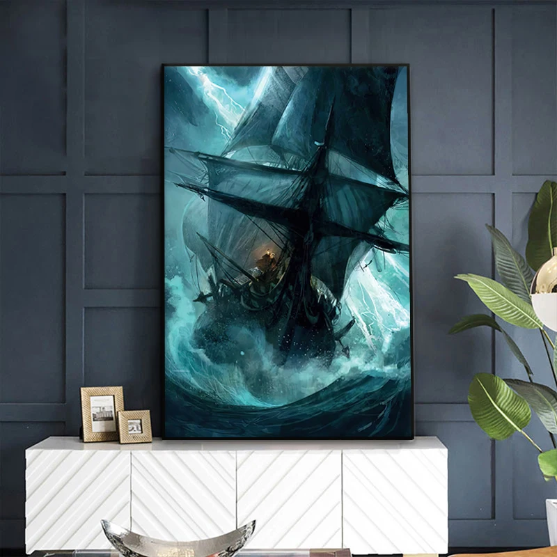Картина с изображением корабля призрака на море, винтажный постер с голубым парусником, настенные картины для украшения гостиной
