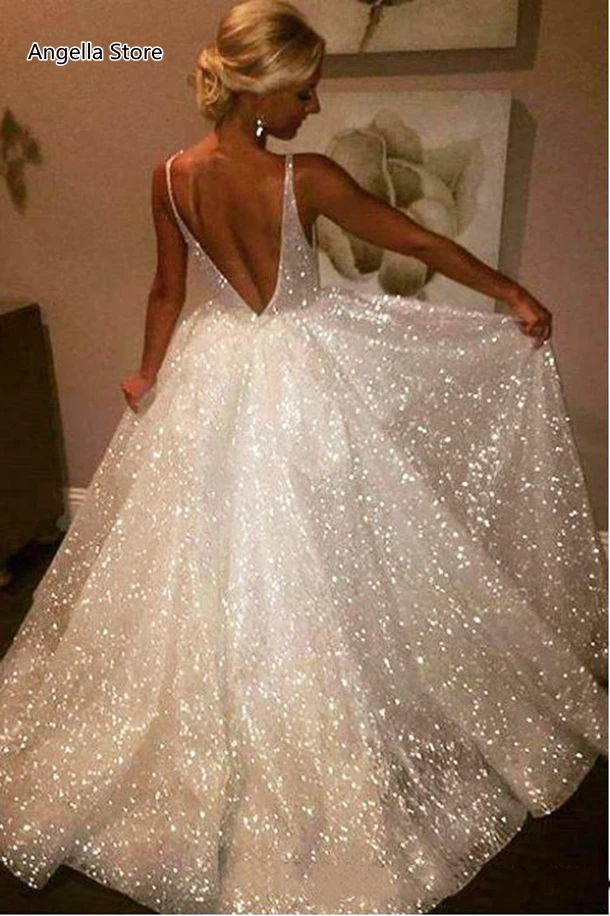 К требованиям заказчика; Сверкающие; С белыми блёстками платье трапециевидной формы свадебные платья 2021 сексуальное платье с v-образным вырезом, с ремешком в стиле Бохо пляжные свадебные платья в пол Длина размера плюс
