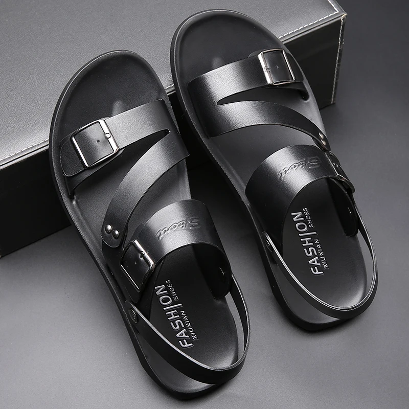Сандалии мужские кожаные, пляжная обувь, плоская подошва, черные, л...