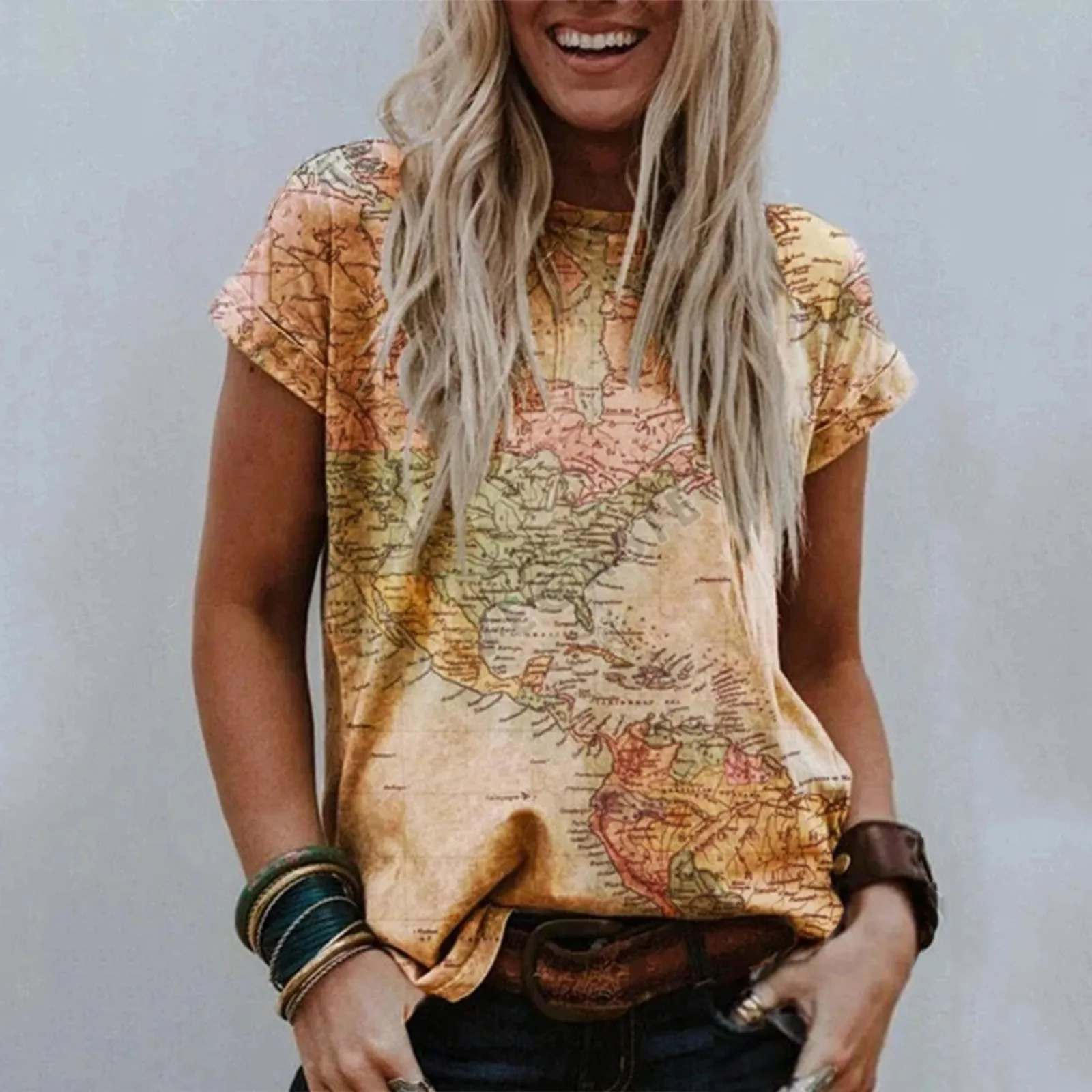 Женская футболка в стиле Харадзюку, топ с коротким рукавом и круглым вырезом, принтом карты земли, повседневные футболки, топ 40 #, размера плюс, лето