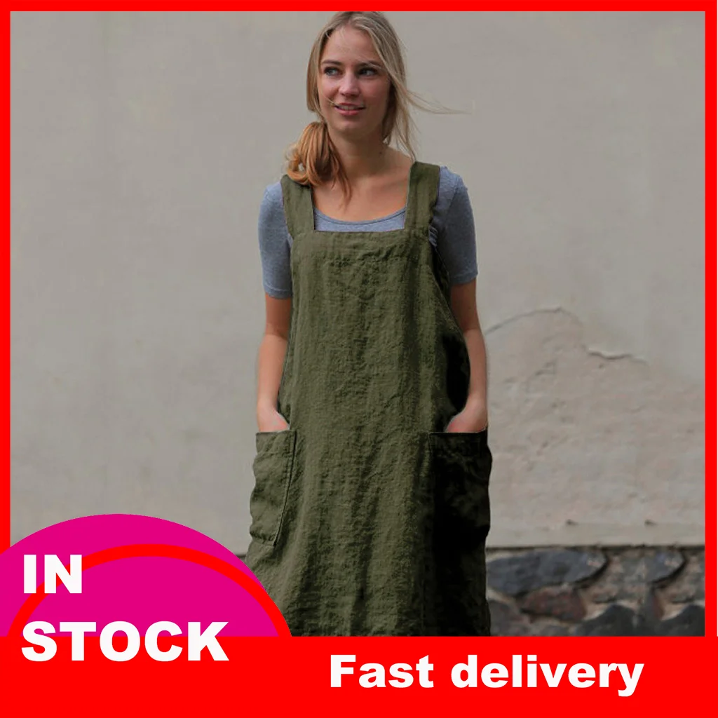 Женское хлопково-льняное платье 40 # с квадратным перекрестным передником, садовое платье для работы, однотонное платье до колен без рукавов с карманами