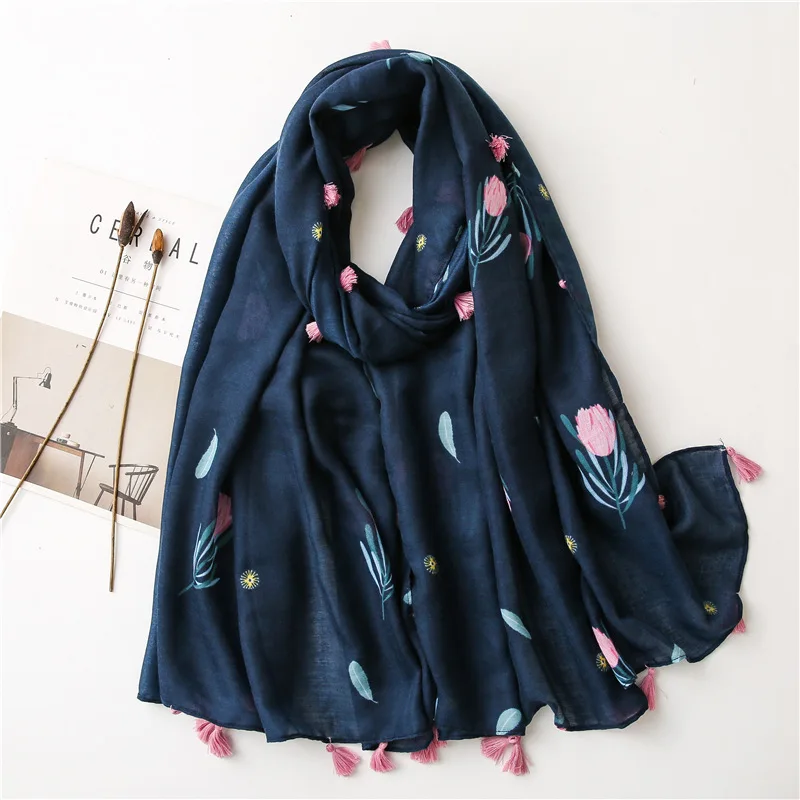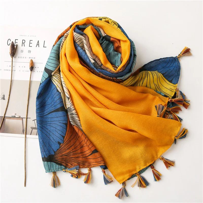 Женский хлопково-льняной шейный платок с цветочным принтом, модный брендовый шарф, шали и палантины, летние солнцезащитные шарфы с кисточками