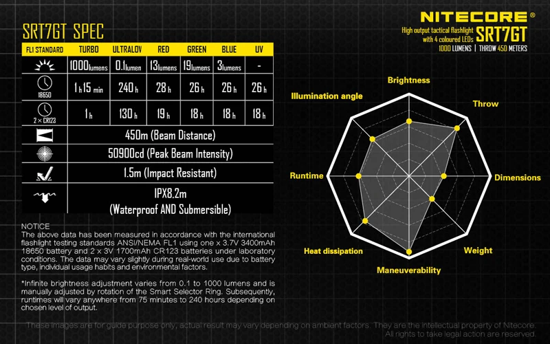Имеет пиковую интенсивность луча 50,900cd и расстояние броска до 450Метров (ANSI FL1)