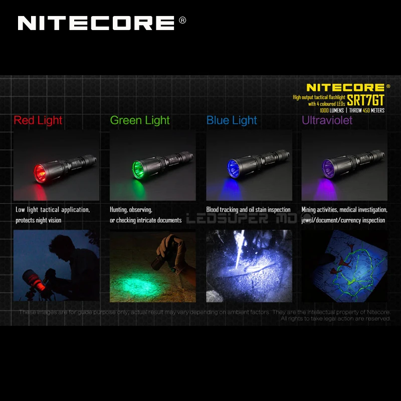Будьте готовы кNitecore SRT7GT тактический фонарь, Обновление до любимыхSRT7. Теперь оснащенный светодиодный светильник CREE XP-L HI V3, SRT7GT выдает до 1000 люменов, яркий белый светильник, Видимый до впечатляющего расстояния 1500 футов. Запатентованная технология Nitecore Smart Ring третьего поколения позволяет пользователям переключаться между белыми, красными, синими, зелеными и УФ-выходами с поворотом. Белый выход также может быть бесконечно отрегулирован в пределах 1000 люменов для индивидуального освещения каждый раз.Изготовлен из авиационного алюминиевого сплава и покрыт жестким анодированным покрытием военного класса, SRT7GT настолько прочный, насколько он универсален. Он может противостоять опускается до 1,5 м и защищен от повреждения водой с IPX-8 рейтинг в повреждения водой, что делает его способен погружаться до 2 метров. SRT7GT несомненно станет мгновенным фаворитом среди военного персонала, безопасности и охотников, ищущих высокую производительность и полезность от своего фонарика.