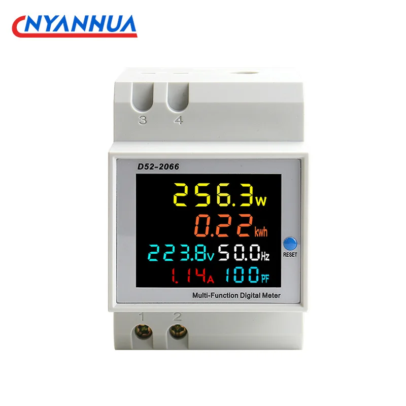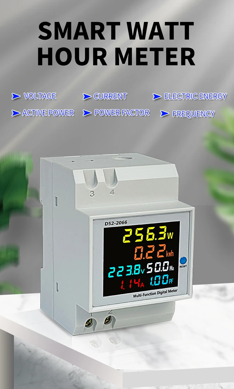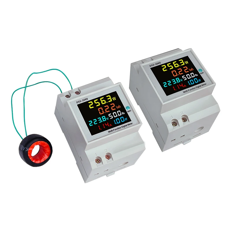 Многофункциональный измеритель направляющего типа D52-2066 с цифровым дисплеем одновременно отображает на приборе 6 параметров, таких как переменное напряжение, переменный ток, активная мощность, коэффициент мощности, частота и электрическая энергия. Измеритель использует цветной полноэкранный ЖК-дисплей высокой четкости для отображения результатов измерений.