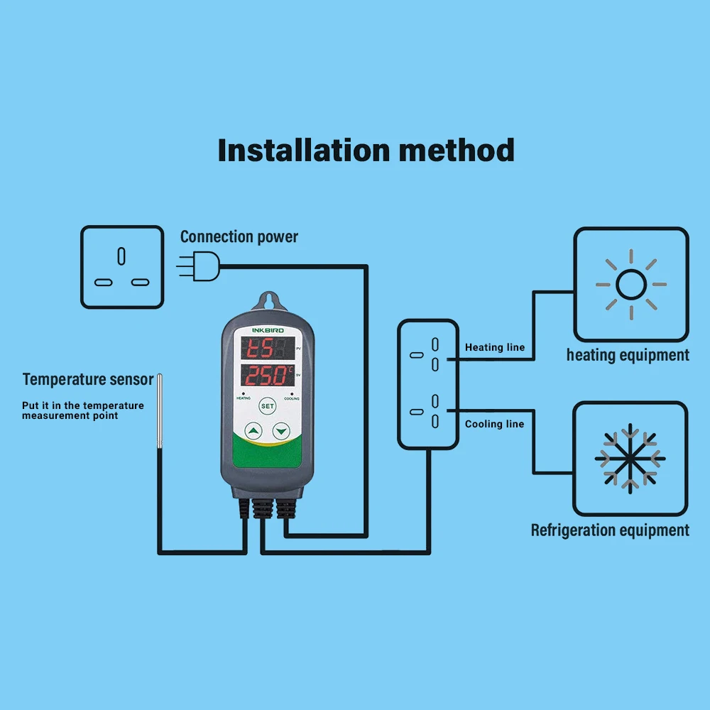 Его можно использовать в качестве защиты от перегрева и автоматической системы контроля температуры для различных электрических приборов, таких как оборудование для домашнего пивоварения, вентиляторов, аквариумов, разведения домашних животных, инкубации, барбекю, саженцев, тепловых ковриков, контроль температуры печи, Наземный контроль тепла, цикл постоянной температуры теплового насоса, ферментация культуры, ускорение прорастания, Электрический радиатор, электрическая духовка и т. Д.