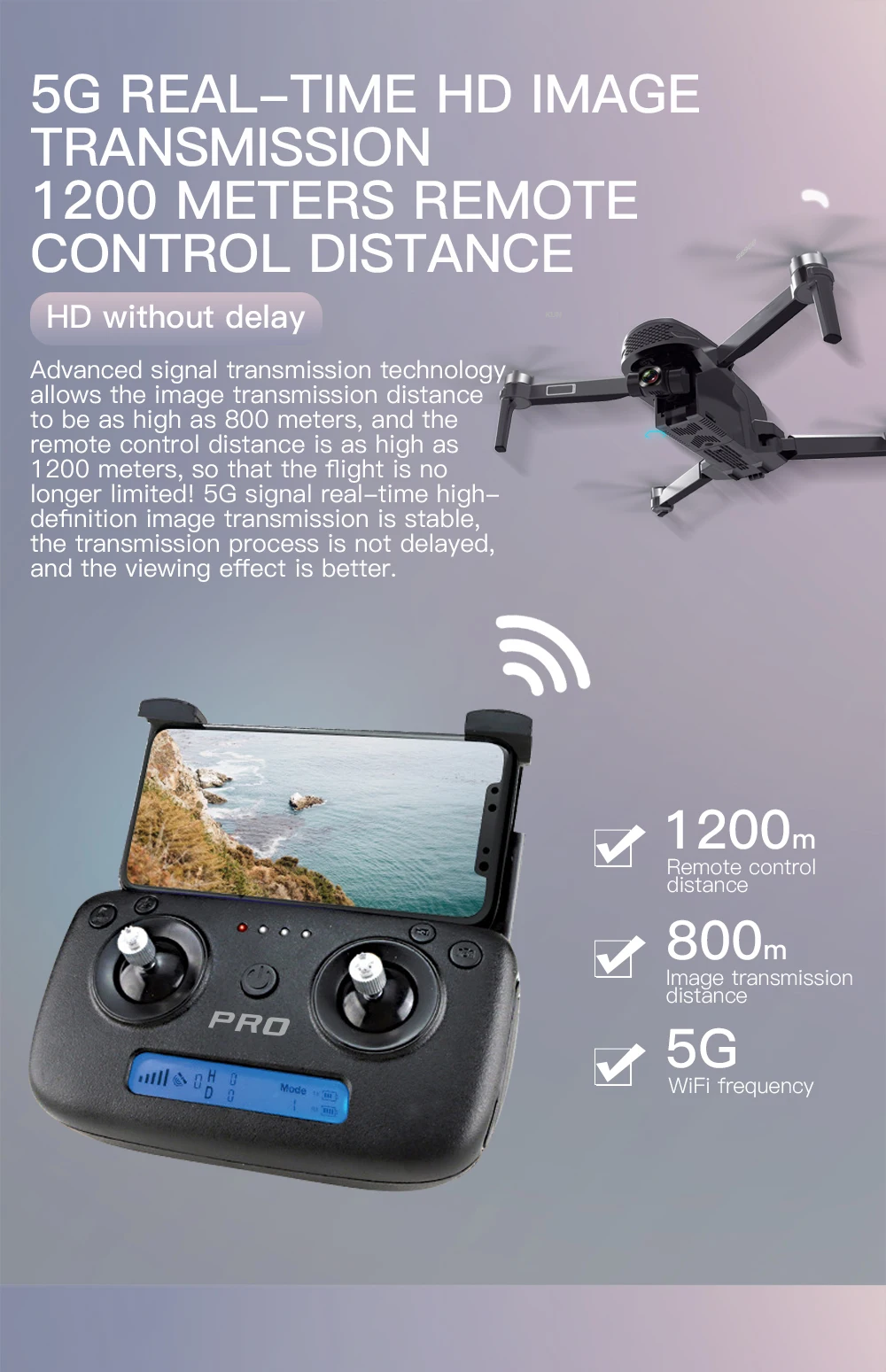 5G Wi-Fi и передача в реальном времени-Передовая технология передачи сигнала позволяет передавать изображение на расстоянии до 800 метров, И расстояние дистанционного управления составляет 1200 метров, так что полет больше не ограничен! 5G стабильная передача изображения в режиме реального времени. Процесс передачи не задерживается, и эффект просмотра лучше.