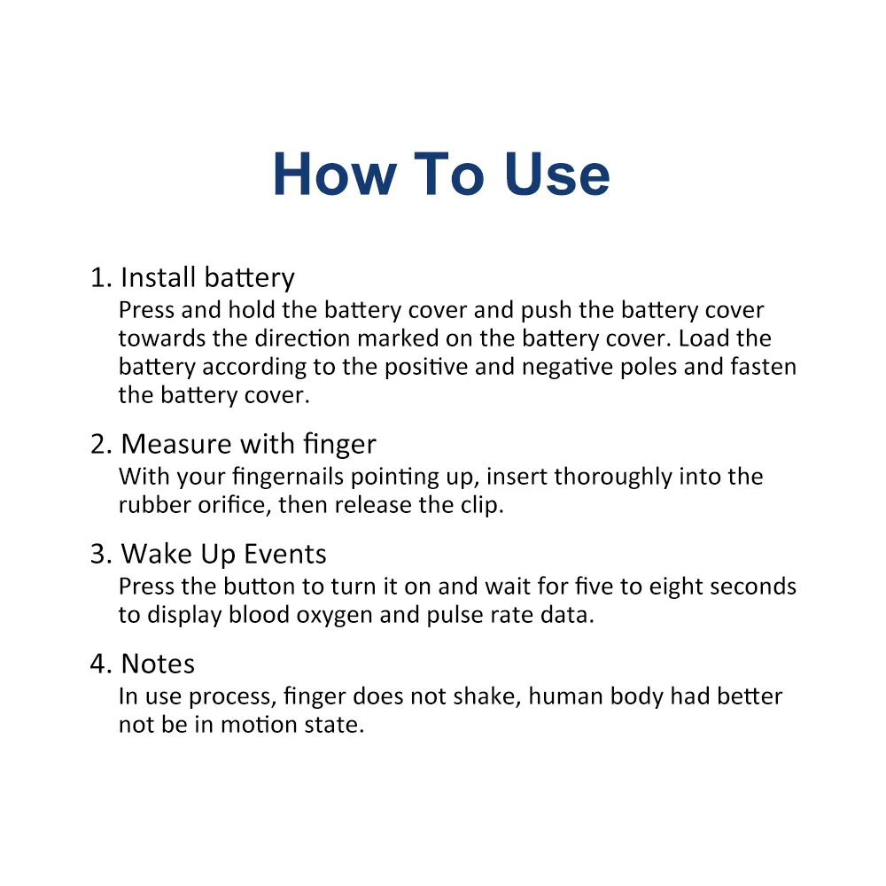 Особенности:Пальчиковый Пульсоксиметр для простой ежедневной проверки, может использоваться в семьях, школах, социальных центрах, общественных центрах и т. д.Предназначен для измерения насыщения крови кислородом и пульса взрослых или детей, и вы можете использовать его для измерения до или после занятий спортом.Оснащен четким tft-экраном, показывающим значение SpO2, частоту пульса (PR), импульсную волну и т. д.Простой в использовании, откройте зонд, затем вставьте один палец в зонд, включите оксиметр, через несколько секунд результат измерения можно прочитать непосредственно с экрана.Питание от 2 батареек AAA (не входят в комплект), Пульсоксиметр автоматически выключается в 8 с, если нет сигнала пальца.Компактный размер и легкий, с ремешком, удобно носить с собой и использовать в любое время в любом месте.Характеристики:Цвет: белый и синийТип дисплея: TFT дисплейЗаявленная точность SpO2: 70%-99%, ± 2% на этапе 80%-99%, ± 3% на этапе 70%-79%PR заявленная точность: 30-240bpm, ± 1bpmИсточник питания: 2 * батарейки типа "ААА" (не входит в комплект)Рабочая температура: 5 ℃-40 ℃Рабочая Влажность: 15%-80%Атмосферное давление: 70kPa-106kPaТовар Размеры: 6*3,2*3,2 см/2,4*1,3 * 1.3inВес изделия: 25 г/0,88 унцийПосылка Размеры: 7*7*4 см/2,8*2,8 * 1.6inПосылка Вес: 41 г/1,4 ozУпаковочный лист:1 * оксиметр1 * ремешок1 * Руководство пользователя (на английском языке)