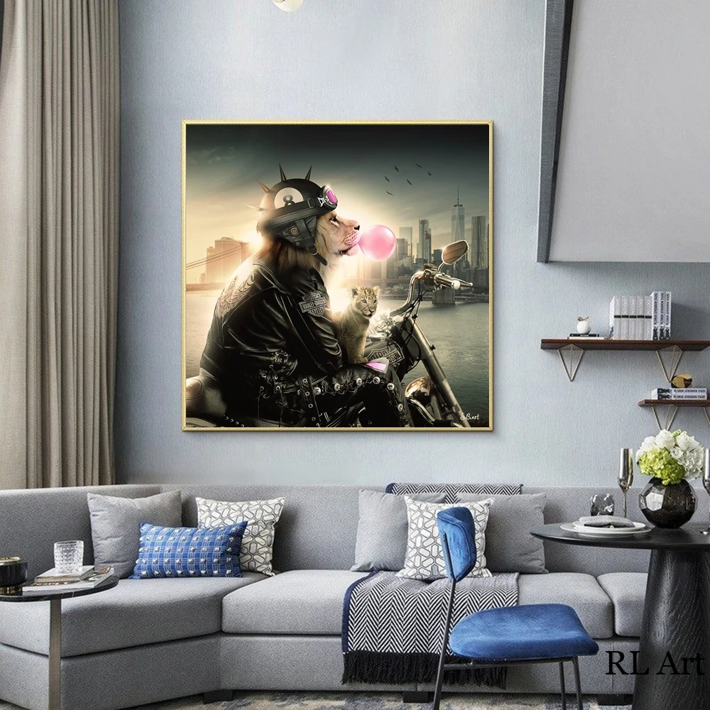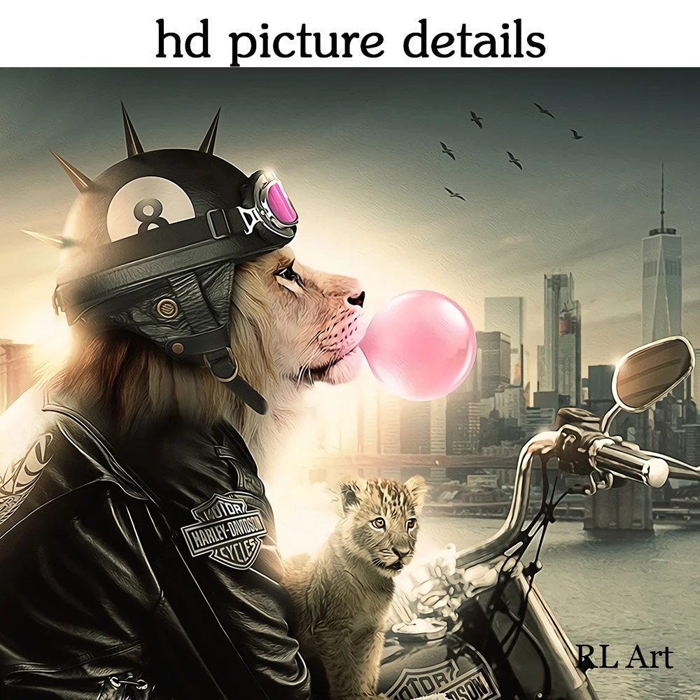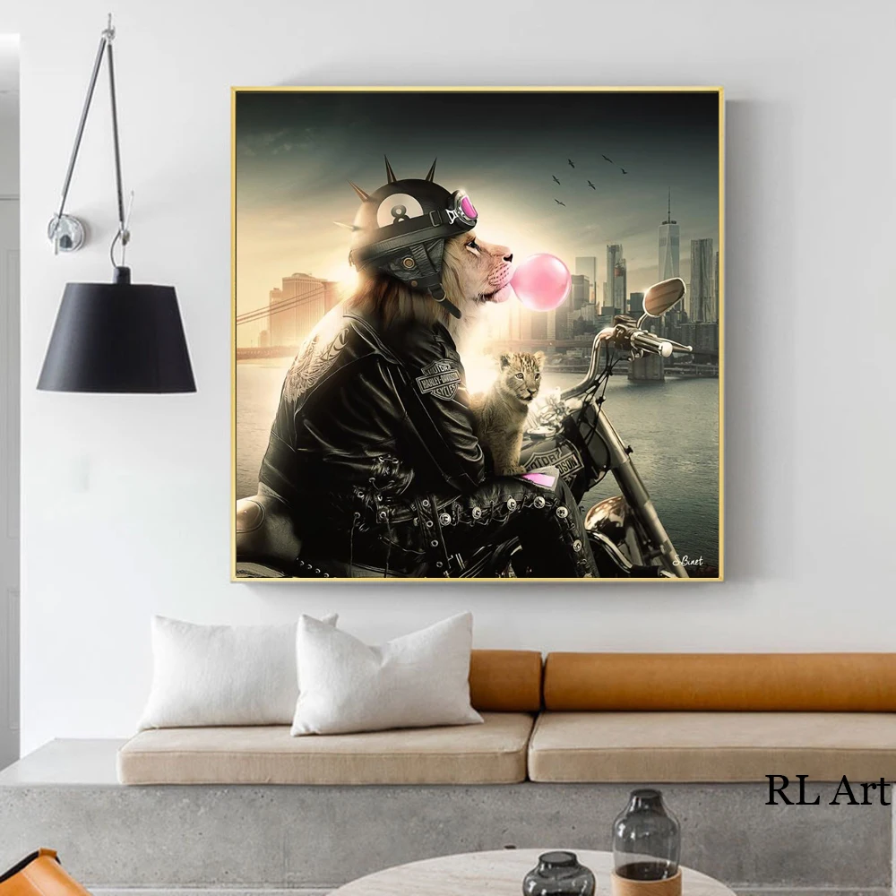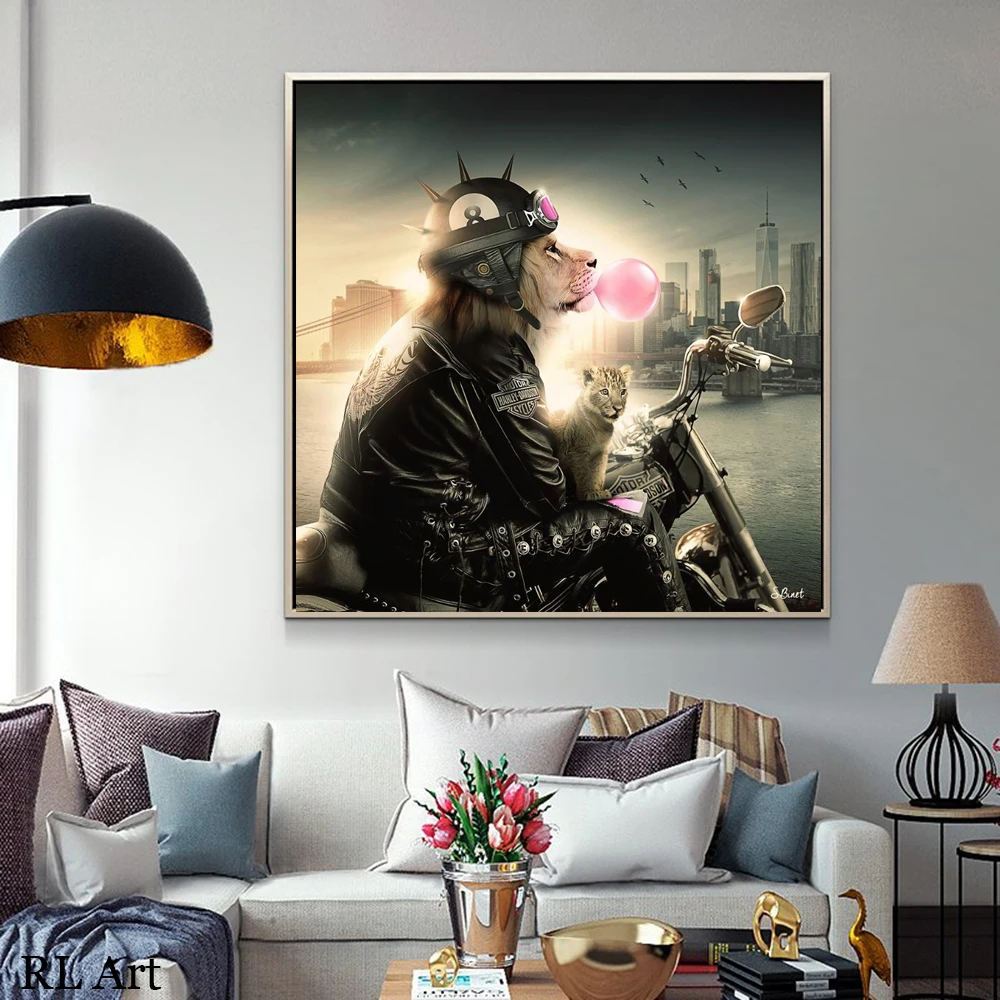 Griffiti Арт холст Современная живопись постеры с животными и отпечатки стены Лев, Папа и сын в байкерском и жоккейском изображение для декора комнаты