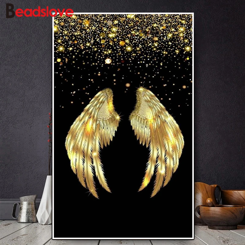 Алмазная мозаика с золотыми крыльями и перьями 5d, алмазная живопись своими руками, вышивка крестиком, мозаика, вышивка, круглые квадратные камни, абстрактные камни S33