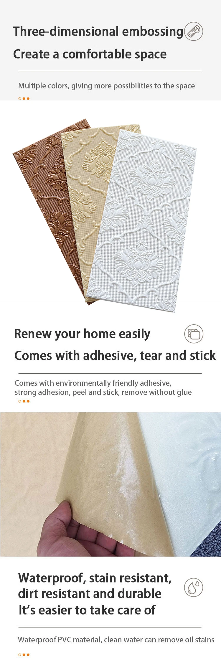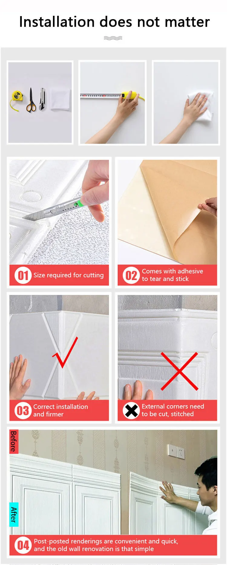 По сравнению с обоями, это безопасный, экологически чистый, нетоксичный и безвкусный, мягкий материал, 3D-эффект, сделай сам, самоклеящийся, простой в установке, случайный коллаж и произвольная резка. Он обладает лучшим шумоподавлением, звукоизоляцией, защитой от столкновений, легкой чисткой, влагостойкими и стойкими к плесени эффектами.