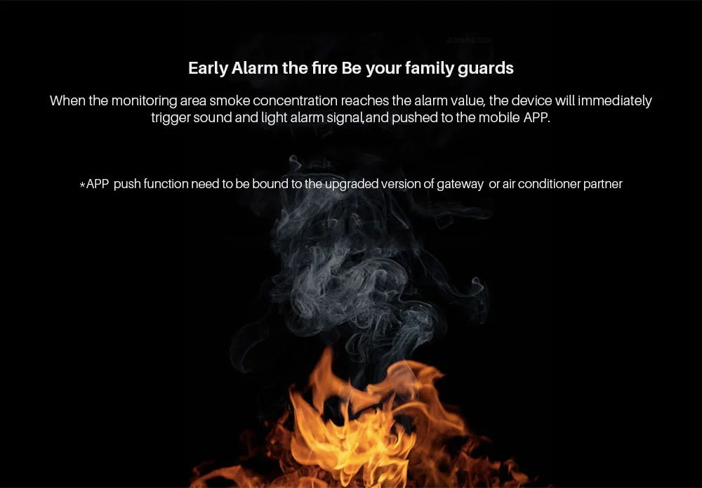 Когда зона мониторинга концентрации дыма достигает значения сигнала тревоги, устройство немедленно вызовет звуковой сигнал и сигнал тревоги, а светильник будет перемещен в мобильное приложение. * Функция push App должна быть связана с обновленной версией шлюза или партнера кондиционера