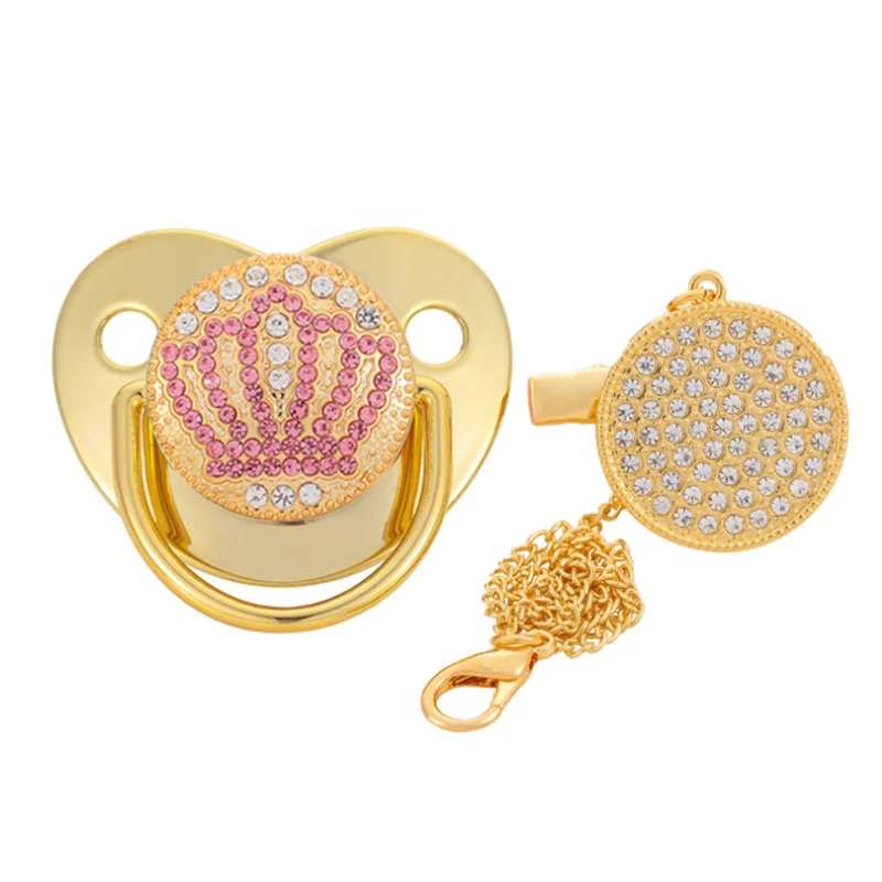 5 цветов золотой блестящий детская пустышка на цепочке с прищепкой, могут варьироваться в зависимости от пожеланий клиента цепи BPA бесплатные силиконовые детские Стразы соска пустышки для младенцев, на возраст от 0 до 18 месяцев, подарок для новорожденных малышей