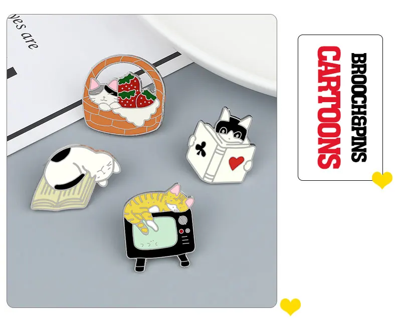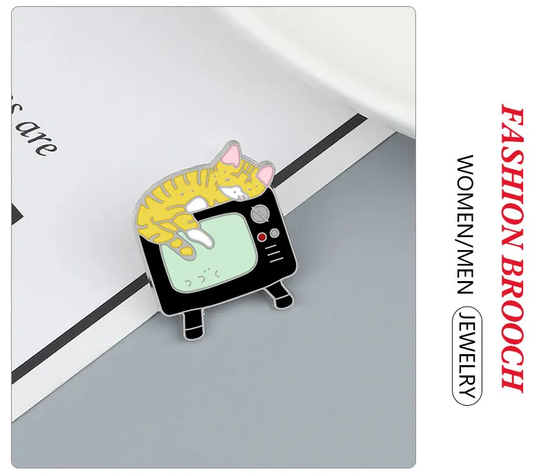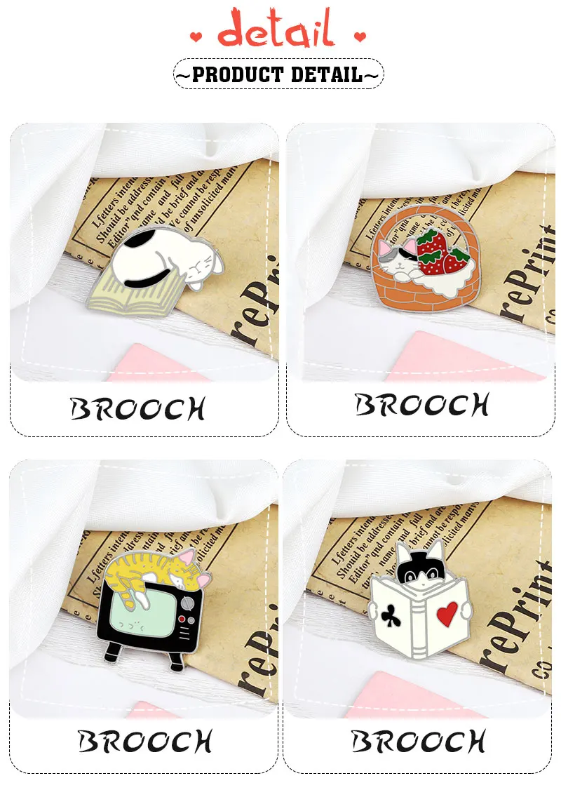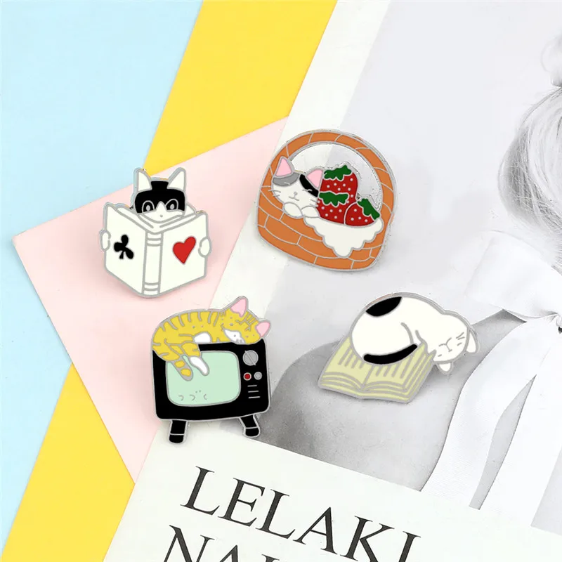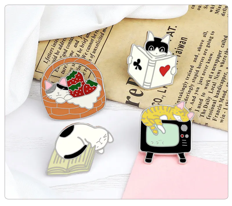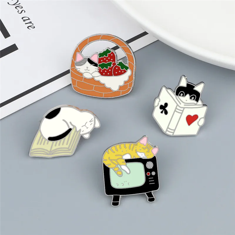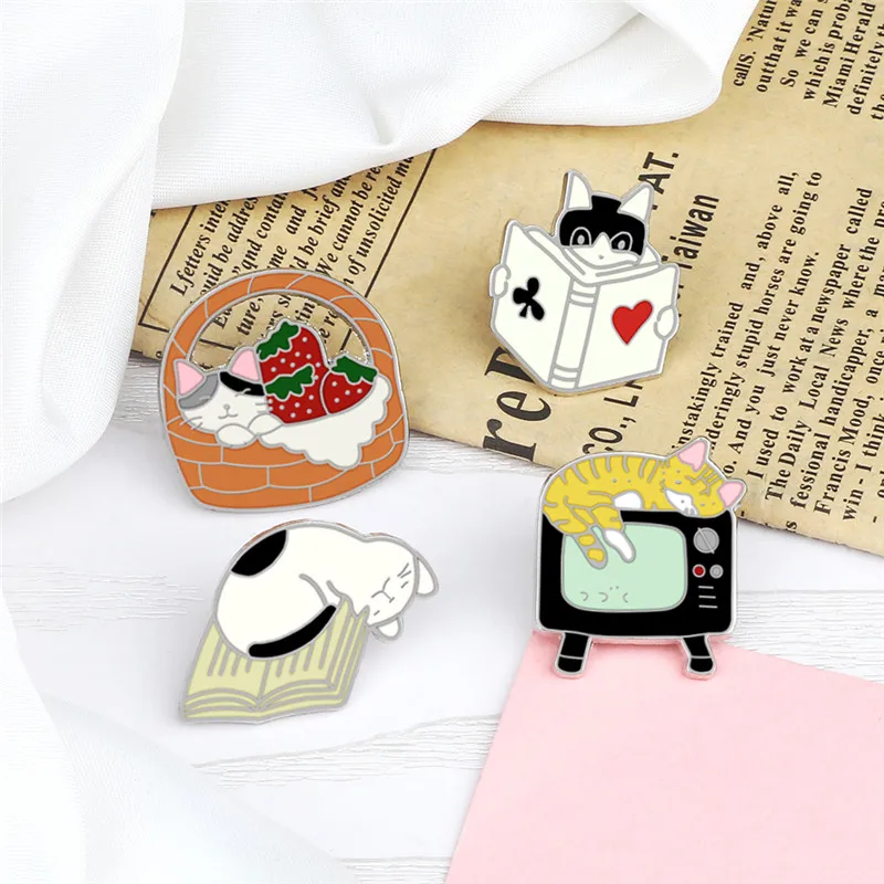 Милые Броши в виде животных, мультяшная корзина, котенок, телевизор, для сна, для учебы, чтения, книга, значок с изображением кота, эмалированные булавки, сумка, одежда, отворот, ювелирное изделие