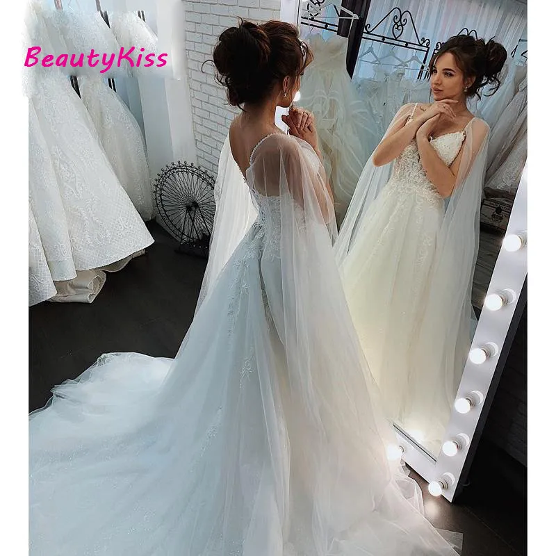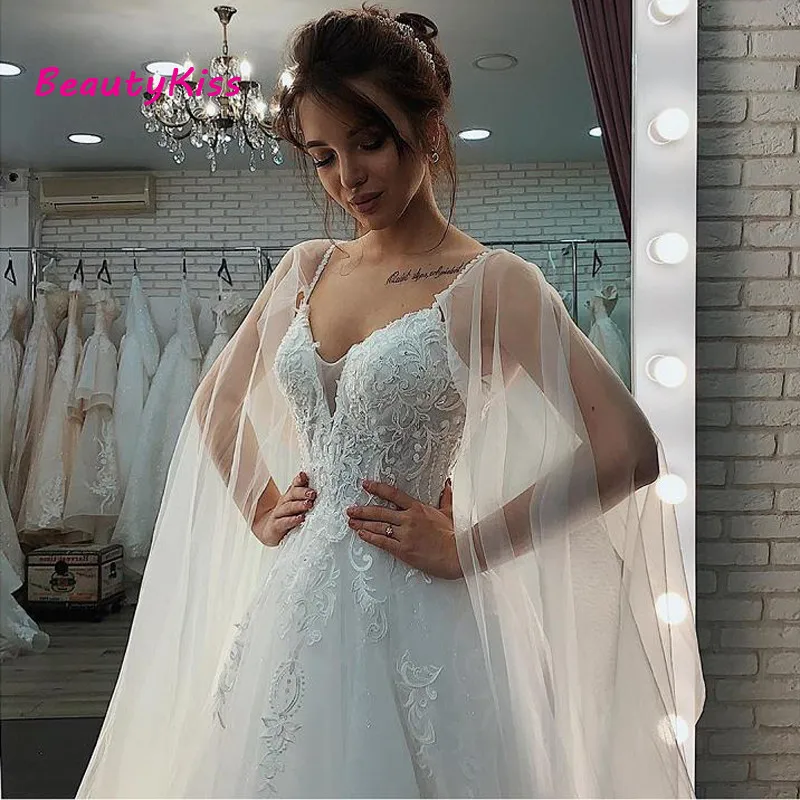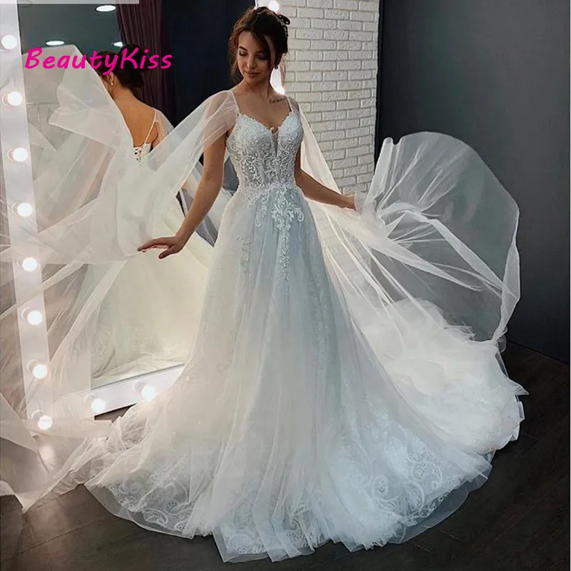 Белое Кружевное Тюлевое платье с бусинами и V-образным вырезом, свадебное платье-трапеция на бретелях-спагетти, длинное свадебное платье со шлейфом для часовни, индивидуальный пошив