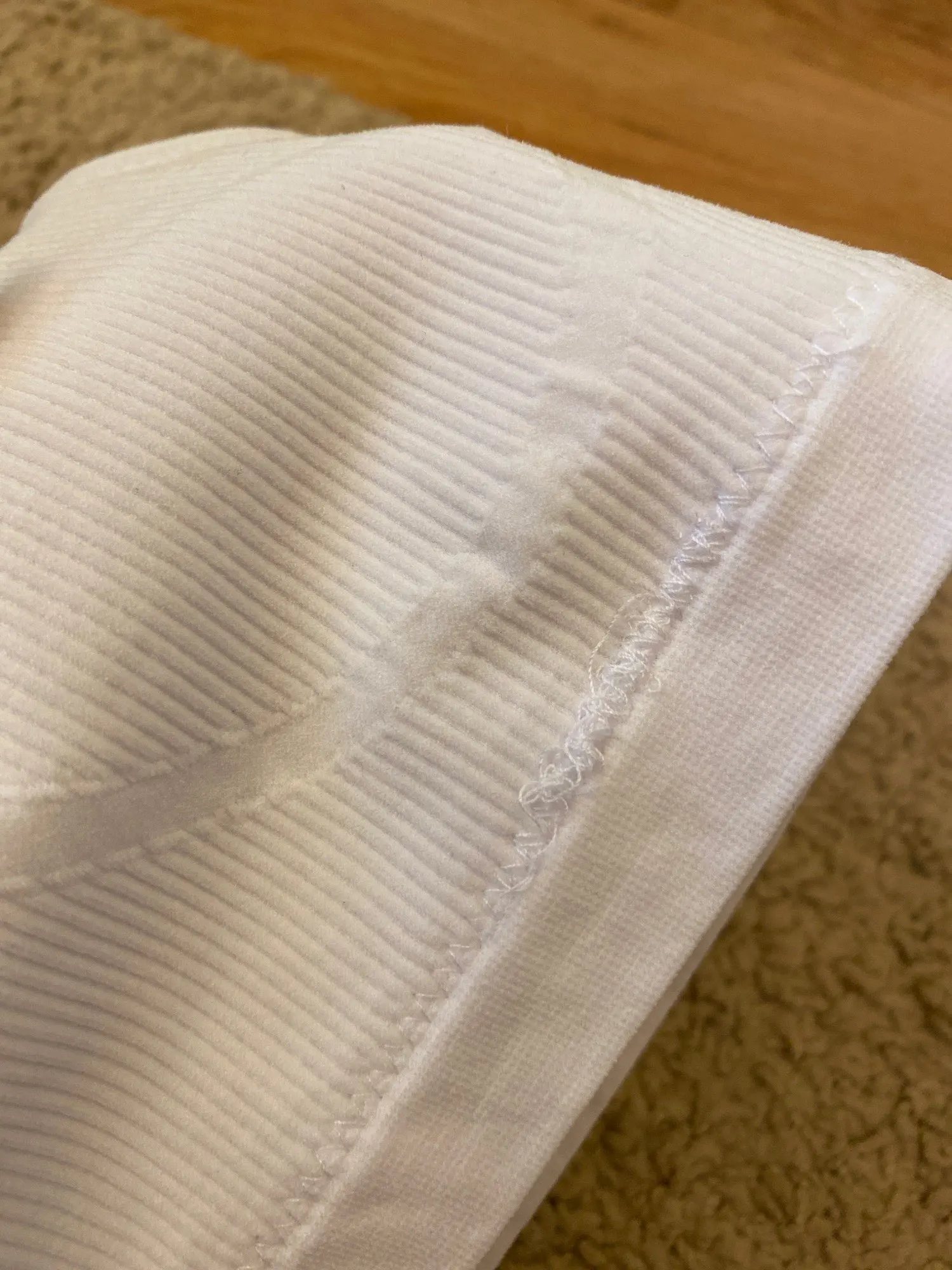 мотериал приятный ,швы вроде ровные, сзади пятно