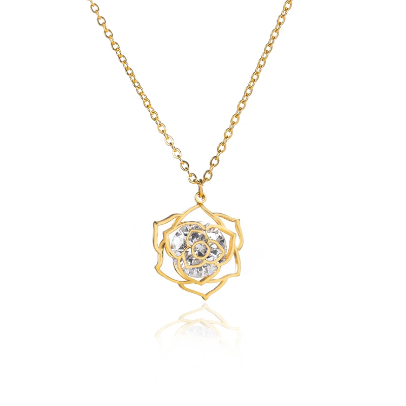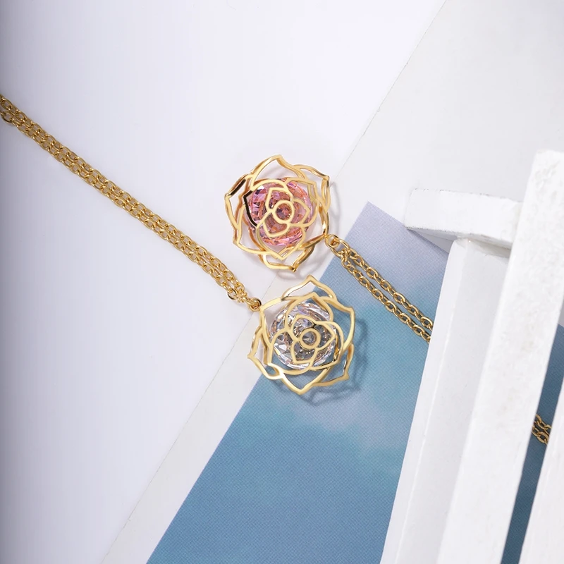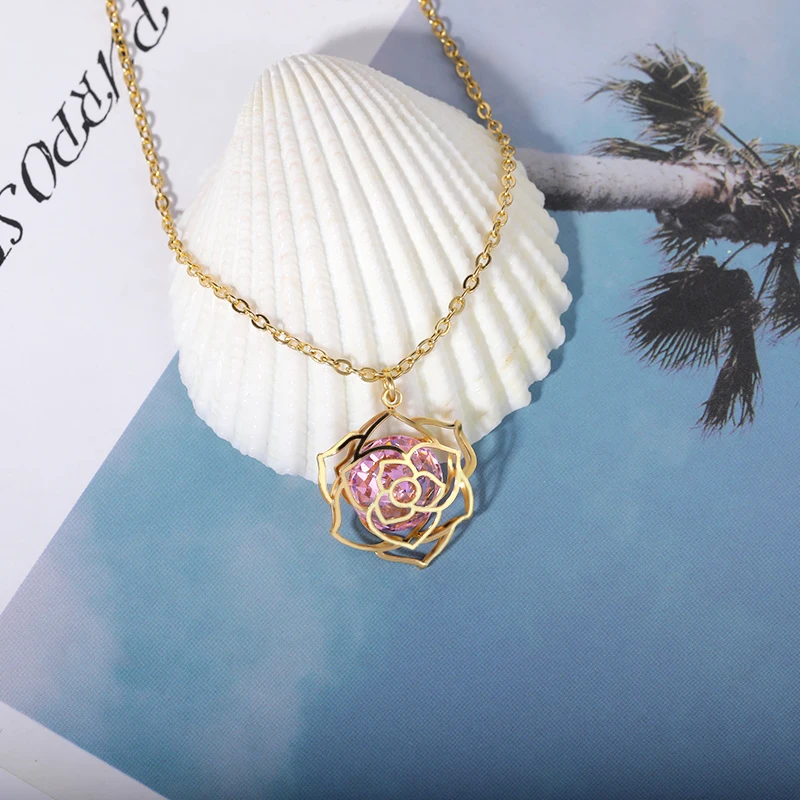 Роскошное сверкающее ожерелье с подвеской в виде цветка розы из фианита для женщин и девушек Подарочное ожерелье для подружки невесты из нержавеющей стали красавицы и чудовища