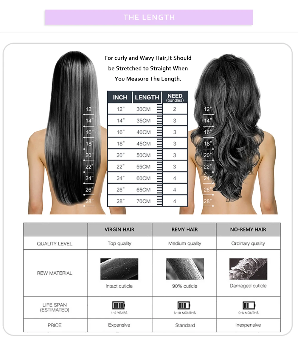 Примечание: обычно вес пучка составляет 95 г-100 г, мы предлагаем вам взять 3-4 пряди на полную голову. Особенно для длины от 20 до 30 дюймов необходимо 4 Связки.