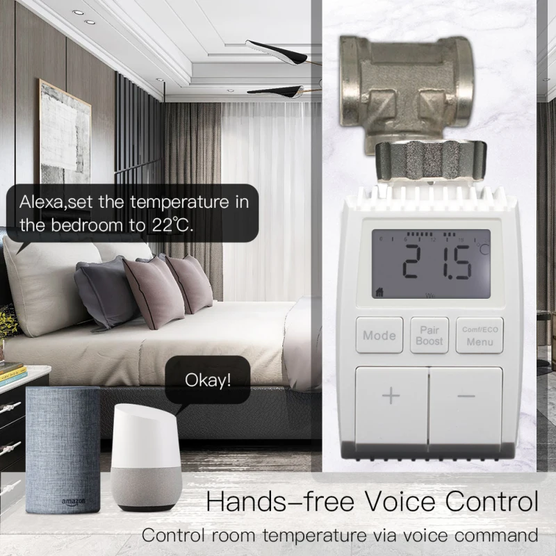 Устройство перемещает клапан для интеллектуального контроля потока тепла на радиатор. С помощью термостатного Радиаторного клапана вы сможете удобно регулировать температуру в помещении в пределах 5-30 °C и экономить более 15% энергии.