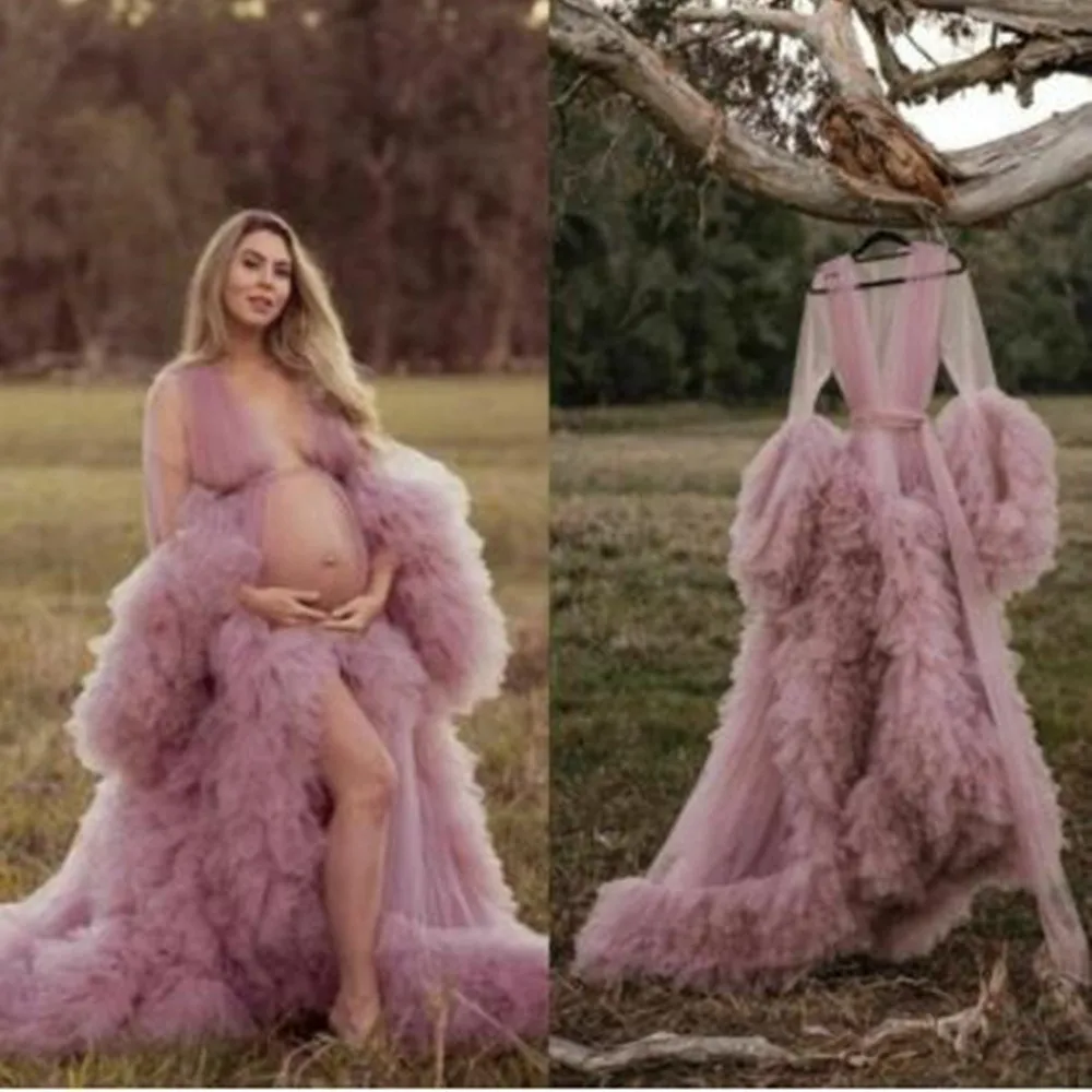 Пыльное розовое платье для беременных выпускного вечера халаты для фотосессии или детского душа с рюшами тюлевые шикарные женские платья ночная рубашка халат для фотосъемки