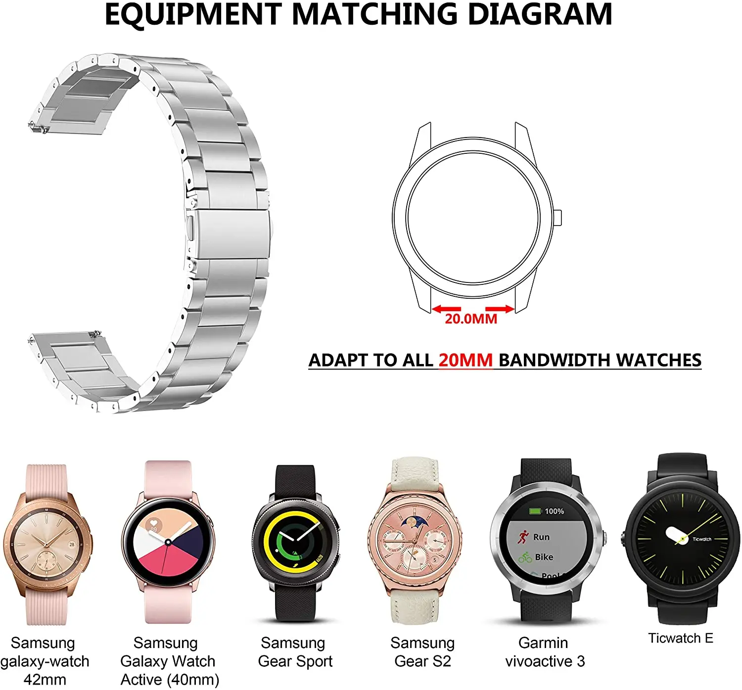 1 * ремешок (в комплект не входят часы) 1 * Инструмент регулировки длины ремешка (бесплатный подарок не поддерживает послепродажное обслуживание) Совместимые модели 20 мм: Для Samsung Galaxy Watch 4 40 мм Для Samsung Galaxy Watch 4 Classic 42 мм Для Samsung Galaxy Watch 4 44 мм Для Samsung Galaxy Watch 4 Classic 46 мм Для Samsung Gear S2 Classic Для Samsung Gear Sport Для Samsung Galaxy Watch Active Для Samsung Galaxy смотреть активный 2 40/44 мм Для Samsung Galaxy Watch 42 мм Для Moto 360 2nd Gen Мужской 42 мм Для Fossil Q Gazer Для LG Watch Sport Для Huawei Watch 2 / watch 2 pro Для Pebble Time Round Large Для Withings Steel HR 40 мм Для Huami Amazfit BIP Для Ticwatch 2 / Ticwatch E Для Nokia Steel / Nokina Steel HR Для Garmin Vivoactive 3 / vivoactive 3 music И другие традиционные или умные часы со стандартной шириной «20 мм». 22 мм Совместимые модели: Для Samsung Galaxy Watch 46 мм Для Samsung Gear S3 Classic Для Samsung Gear S3 Frontier Для huawei watch gt 2 / gt 2 46 мм И другие традиционные или умные часы со стандартной шириной «22 мм».