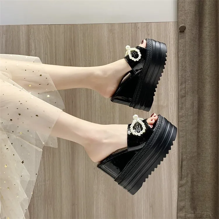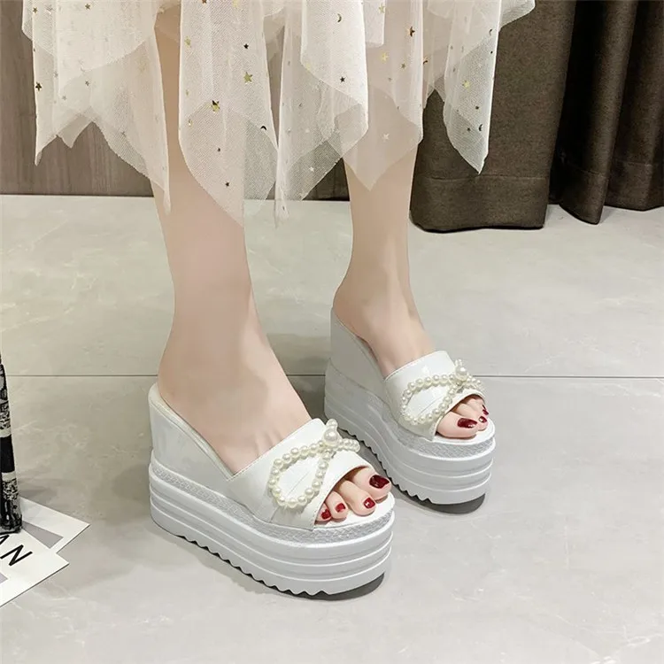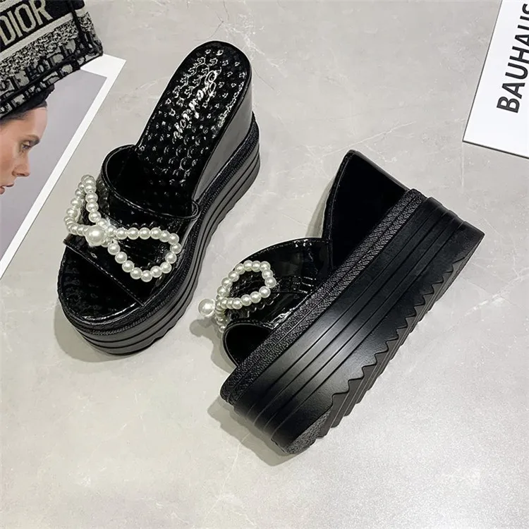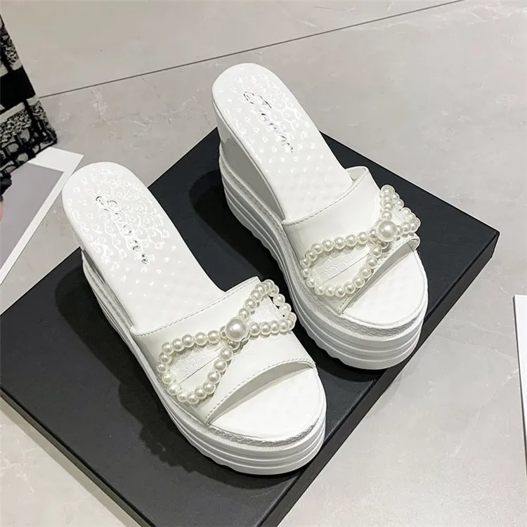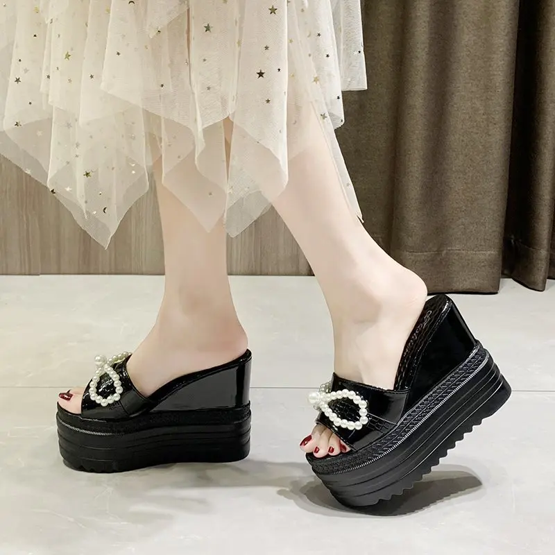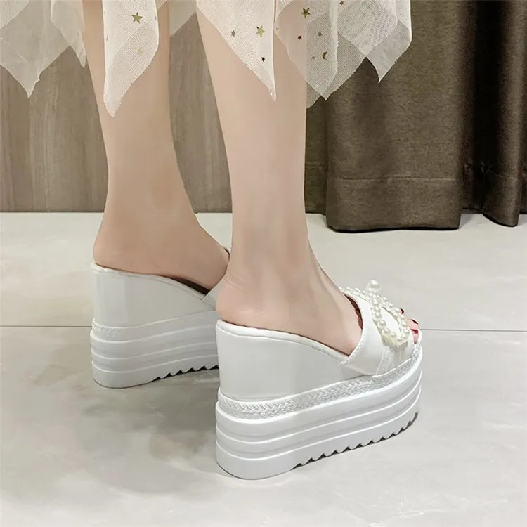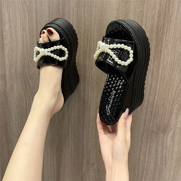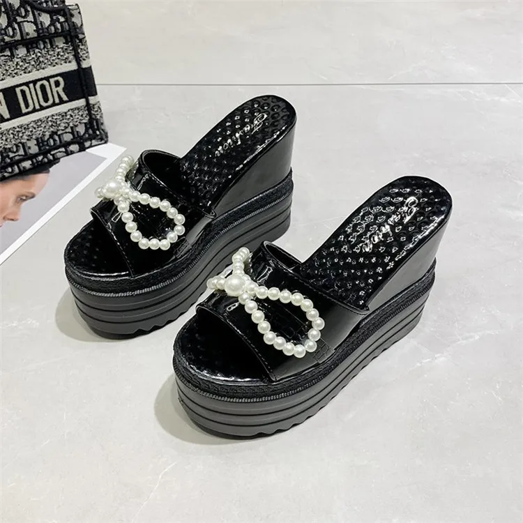 Туфли на танкетке; Шлепанцы на платформе; Женские летние босоножки на высоком каблуке, украшенные жемчугом и бантиком; Женские черно-белые шлепанцы; Женские шлепанцы на каблуке