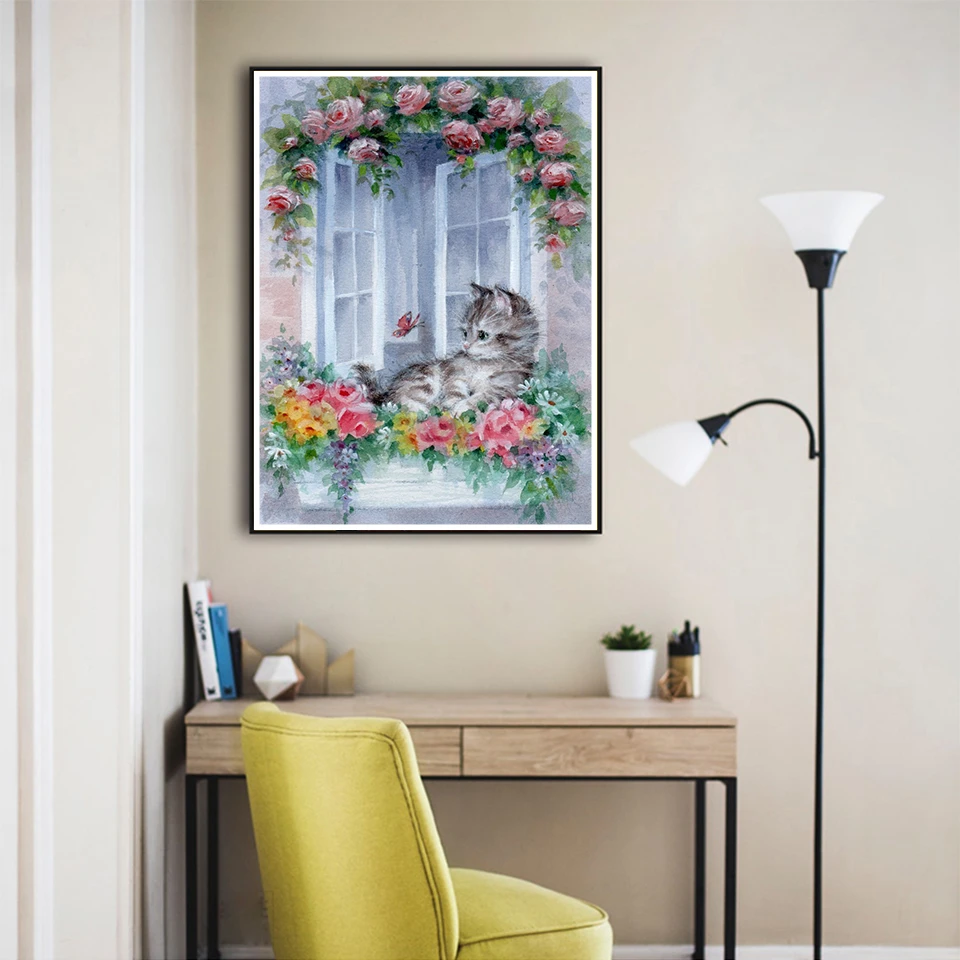 Алмазная 5D Вышивка с кошкой, полноразмерная картина с изображением животного, сада, мозаика из бисера, хобби, искусство, подарок