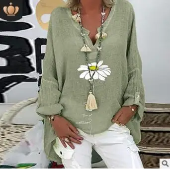 Блузка женская свободного покроя с V-образным вырезом, из хлопка и льна