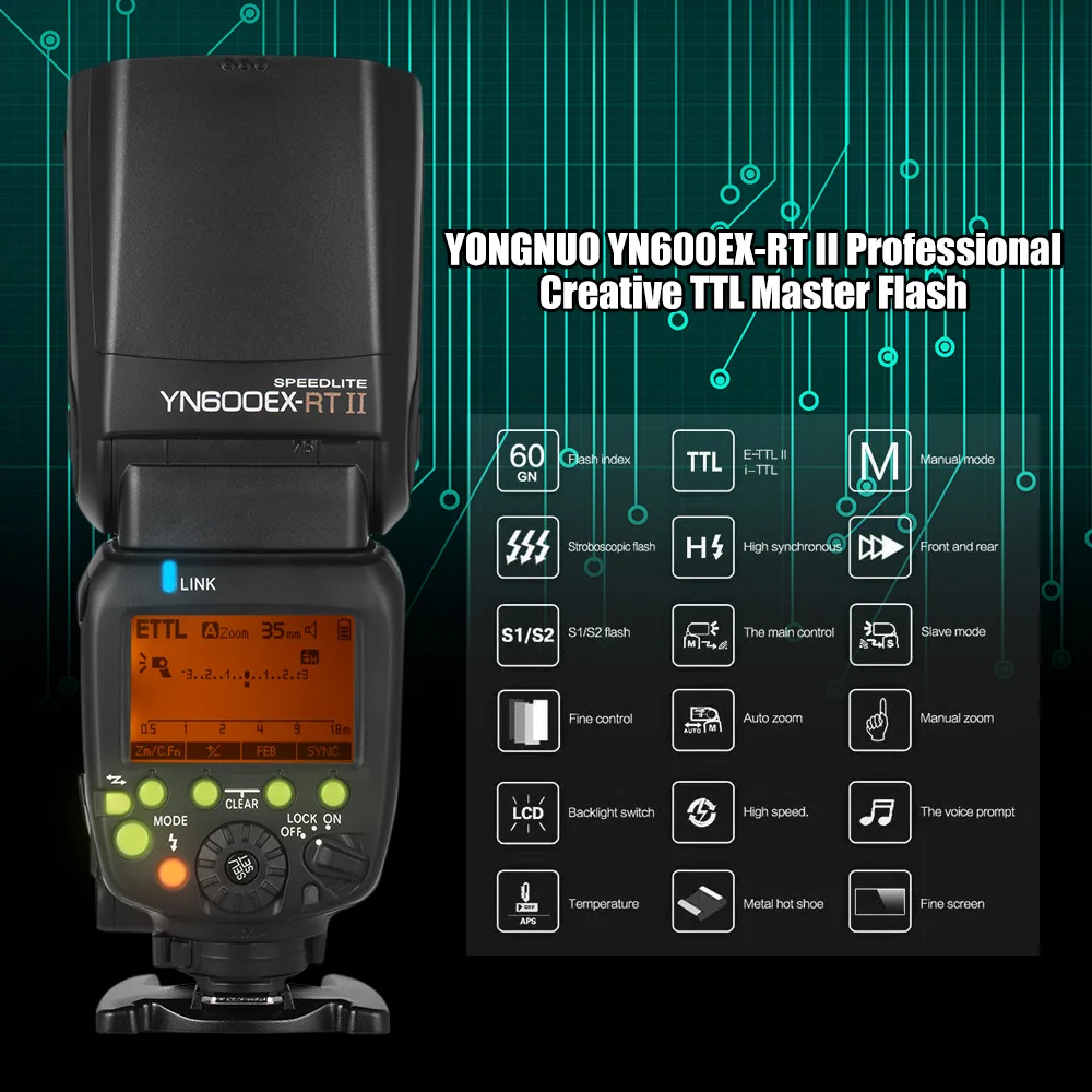 YN600EX-RT II в качестве профессиональной креативной вспышки с высоким количеством направляющих, поддерживает TTL 、 M 、 мульти вспышки.