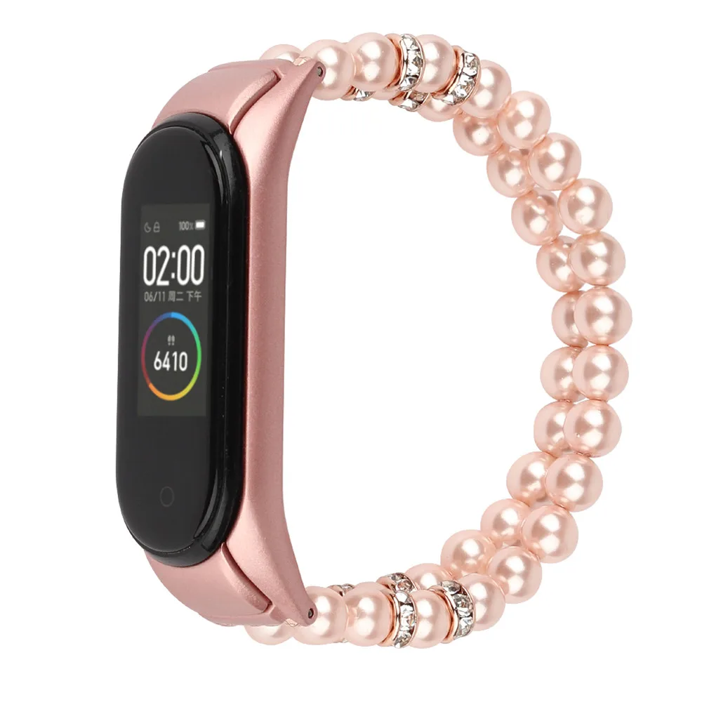 Женский эластичный Эластичный браслет с бусинами для Xiaomi Mi Band 6 5 4 3, ремешок для часов MIband, модный ремешок на запястье с металлической оправой