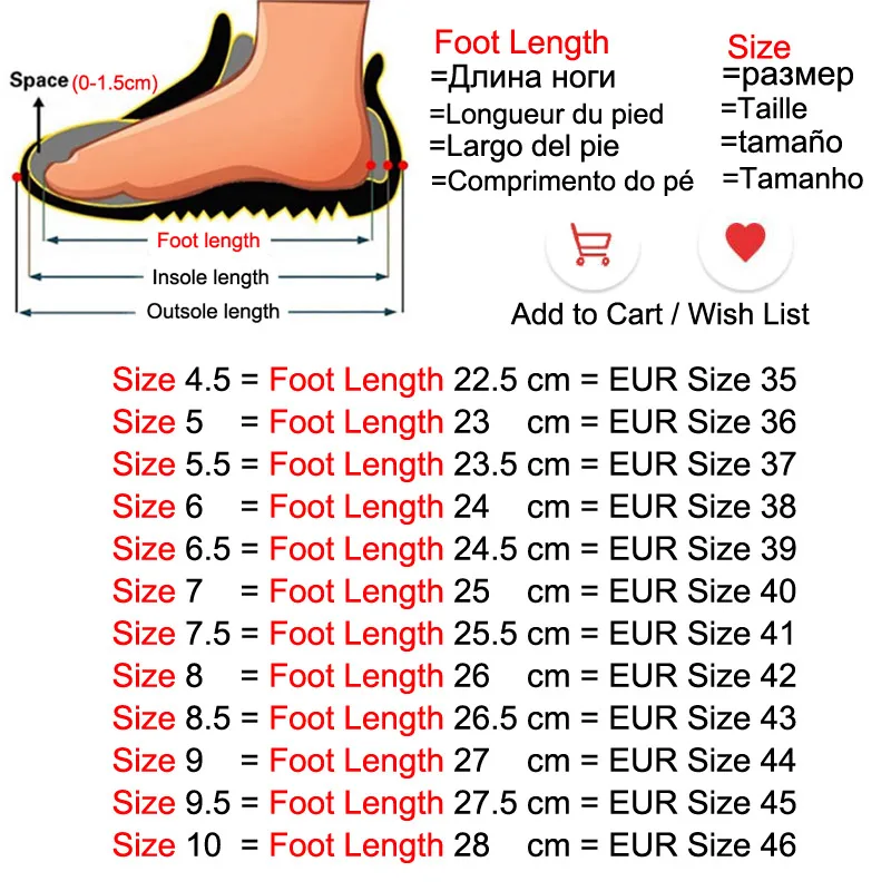 Пожалуйста, измерьте длину стопы, выберите размер в соответствии с длиной стопы.