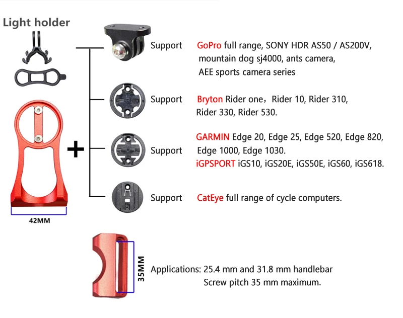 Материал: алюминиевый сплав цвет: красный/черный Применение: Руль 25,4 мм и 31,8 мм Совместимость: GARMIN Edge 20, Edge 25, Edge 520, Edge 820, Edge 1000, Edge 1030, Edge. Bryton Rider one 10 310 330 530. Полный спектр велосипедных компьютеров CatEye. Происхождение: вес Китая 60 граммов собран на передней крышке подъемника, поэтому могут стоять оба, при наличии особых спецификаций можно проконсультироваться с клиентской службой (шаг винта максимум 35 мм) винтовая поддерживающая камера из нержавеющей стали: GoPro full range, SONY HDR AS50 / AS200V, mountain dog sj4000, Муравьи камеры, серия спортивных камер AEE с подвесным сиденьем Gopro будет с подставкой для лампы в коробке 1 * крепление 1 * Сиденье Garmin 1 * сиденье Bryton 1 * Cateye сиденье 1 * держатель света 1 * держатель GoPro 2 * винт из нержавеющей стали следующее фото-это тест-шоу ';