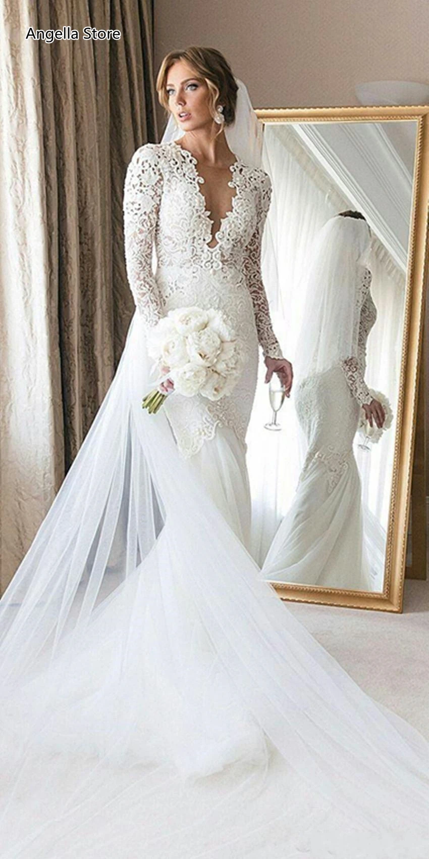 Элегантное кружевное свадебное платье-Русалка для невесты, Прозрачное платье с V-образным вырезом и длинным рукавом, длинные пляжные свадебные платья для невесты, индивидуальный пошив