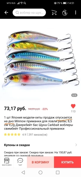 Хороший воблер! Крючки хорошие, острые. Петли не проклеивал, итак все хорошо, воду не набирает. Щуче нравится! Разловил, правда, пока только мелочью до полкило.