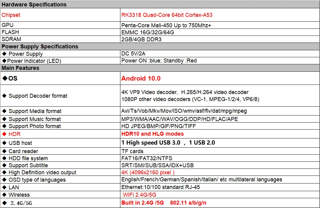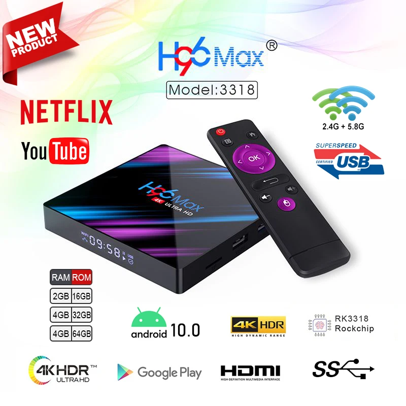 1. ANDROID 10,0 OS и RK3318: с помощью новейшей ТВ-приставки Android 10,0 OS, H96 Max поставляется с мощным четырехъядерным чипсетом RK3318 64 бит, более высокими скоростями передачи данных. 2. Разрешение 4K HD: 4K VP9/H.265 и другой 1080P видео аппаратный декодер; Обеспечивает большую скорость исполнения и реалистичные изображения-Наслаждайтесь максимальным видео. 3. 2,4G/5,0G DUAL WIFI & BT 4,0 & USB 3,0: Этот ТВ-бокс оснащен двойным Wi-Fi 2,4G/5,0G, обеспечивает более прочную и стабильную сетевую среду. 4. Ваш собственный домашний кинотеатр: умные ТВ-боксы поддерживают DLNA и даже имеют возможность 3D, подключите этот смарт-ТВ-бокс с высокоскоростным доступом в Интернет. 5.H96 MAX ANDROID 10.0 TV BOX продукт 1 год гарантии и гарантии: H96 Max Android box tv предназначен для улучшения жизни и облегчения работы.