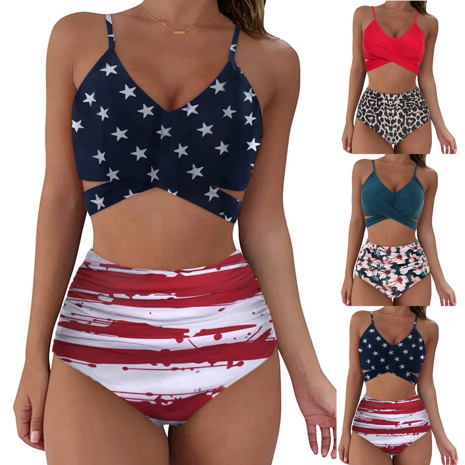 Женский сексуальный однотонный комплект бикини с принтом Пуш-Ап купальный костюм купальник с высокой талией