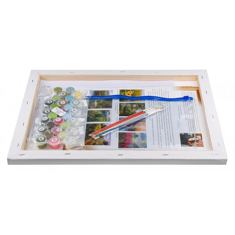 Для рисования мы подготовили хлопковый холст на подрамнике с пронумерованной схемой, кисти с искусственным ворсом и акриловые краски на водной основе. При возникновении трудностей в процессе вы можете ориентироваться на контрольный лист. Кисточки разного размера обеспечивают удобное раскрашивание всех участков. Максимально детализированная схема позволяет добиться качественного и яркого результата.