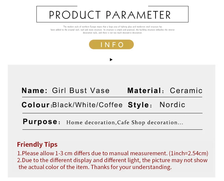 Размер: L21 * W13 * H25 Цвет: белый/черный/кофейный Материал: керамика Количество: 1 шт. В комплект входит: 1 шт./кор. Функция: домашнее украшение, украшение для девочек, офисное украшение, подарок Посылка включает: Ваза для бюста для девочек-1 шт. Характеристика: 1.100% новый и высокое качество 2. Это лучший подарок, и самое элегантное и изысканное украшение. 3. Подходит для домашнего хозяйства, кафе, паба, книжного магазина, домашнего декора