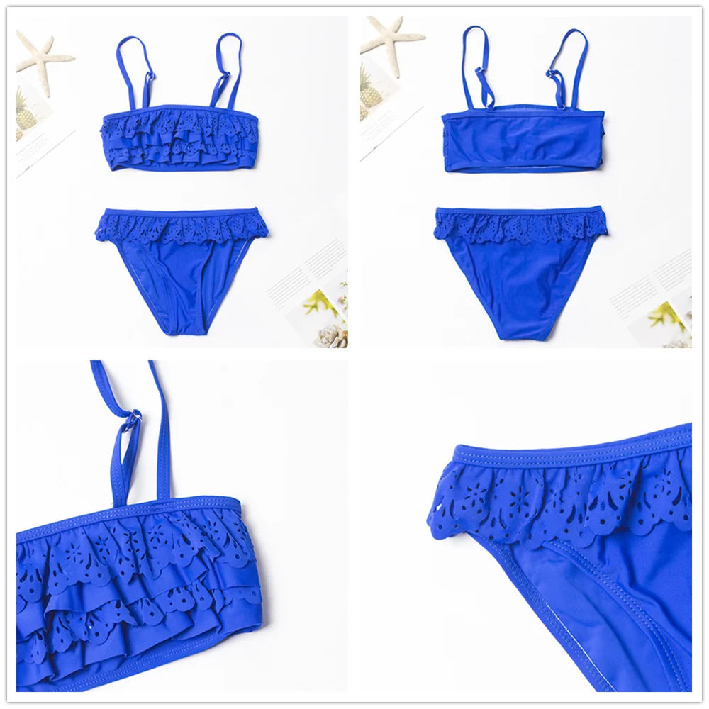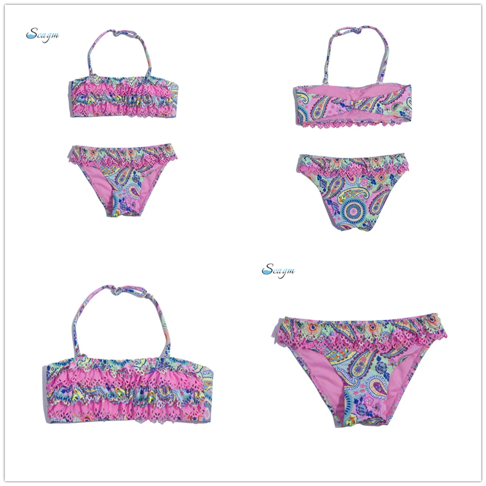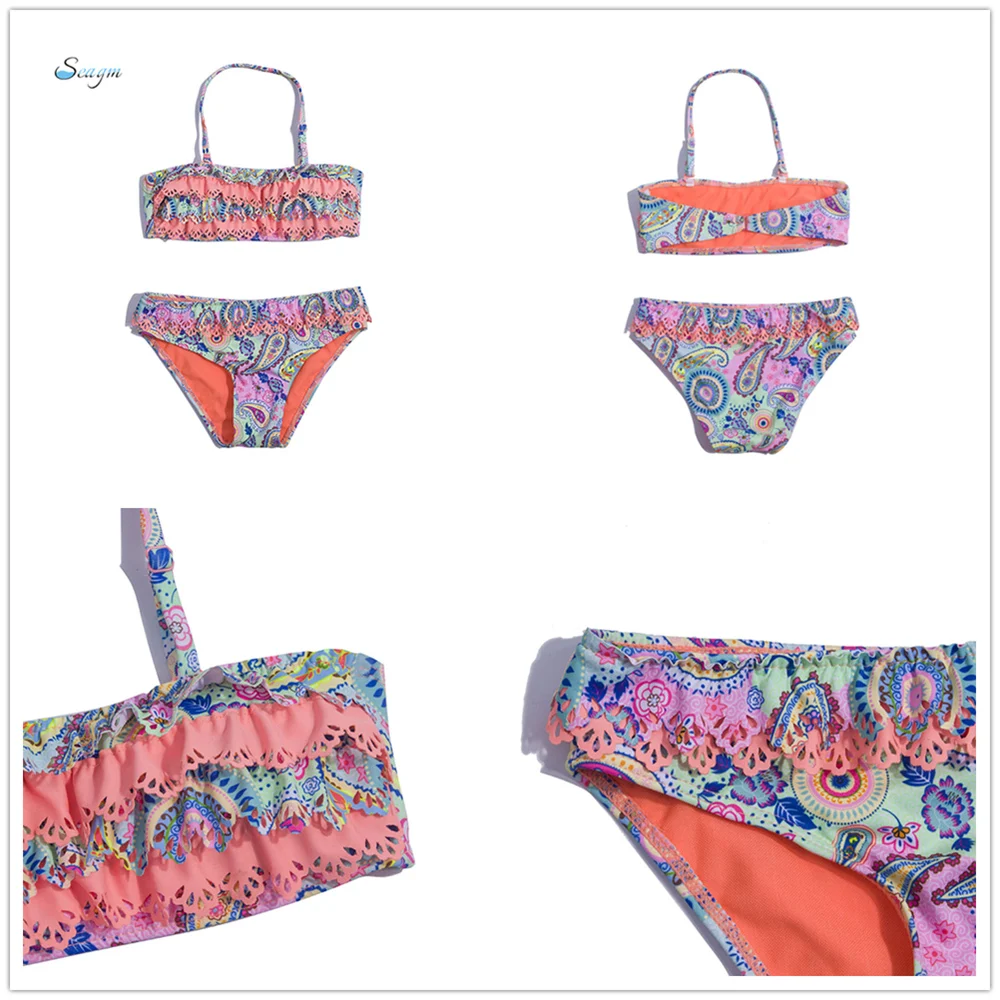 Детский бандажный купальник с принтом листьев, для девочек, От 7 до 14 лет, комплект бикини с оборками, оптовая продажа, Детские бикини, 278