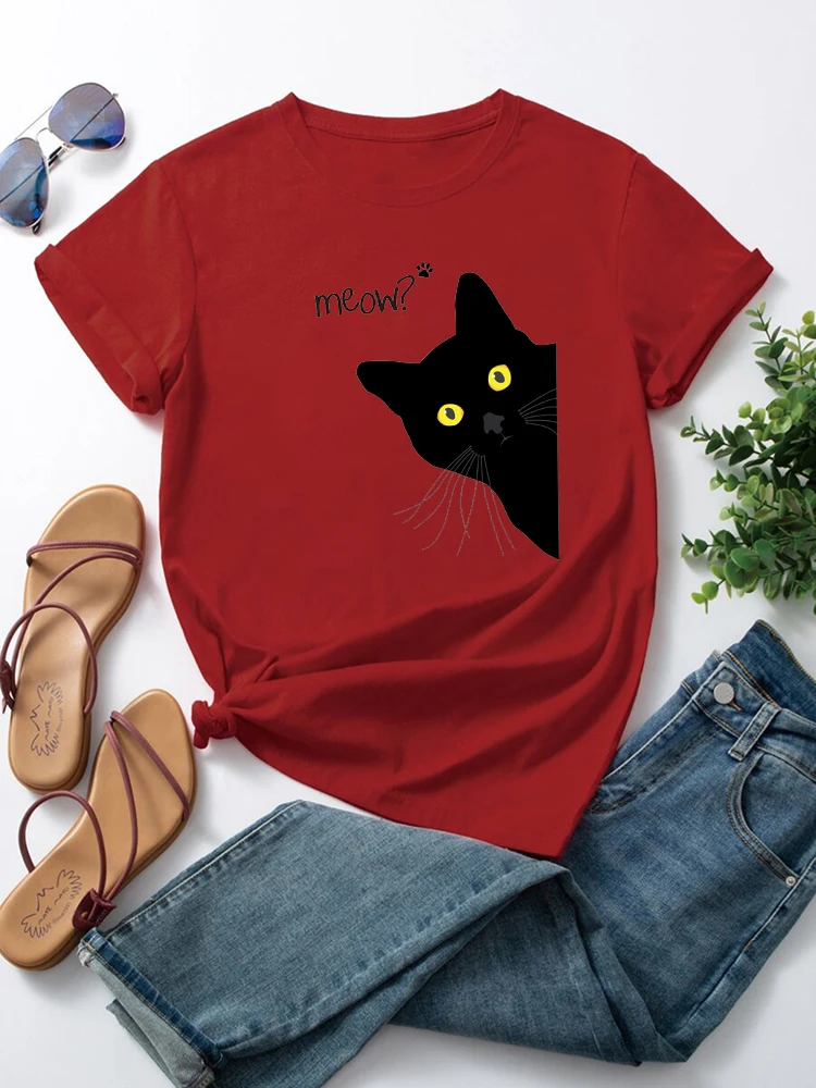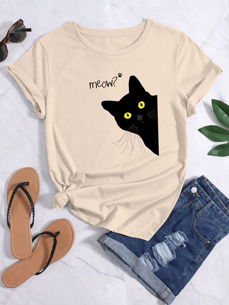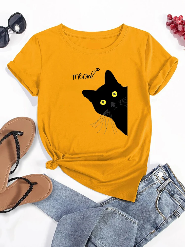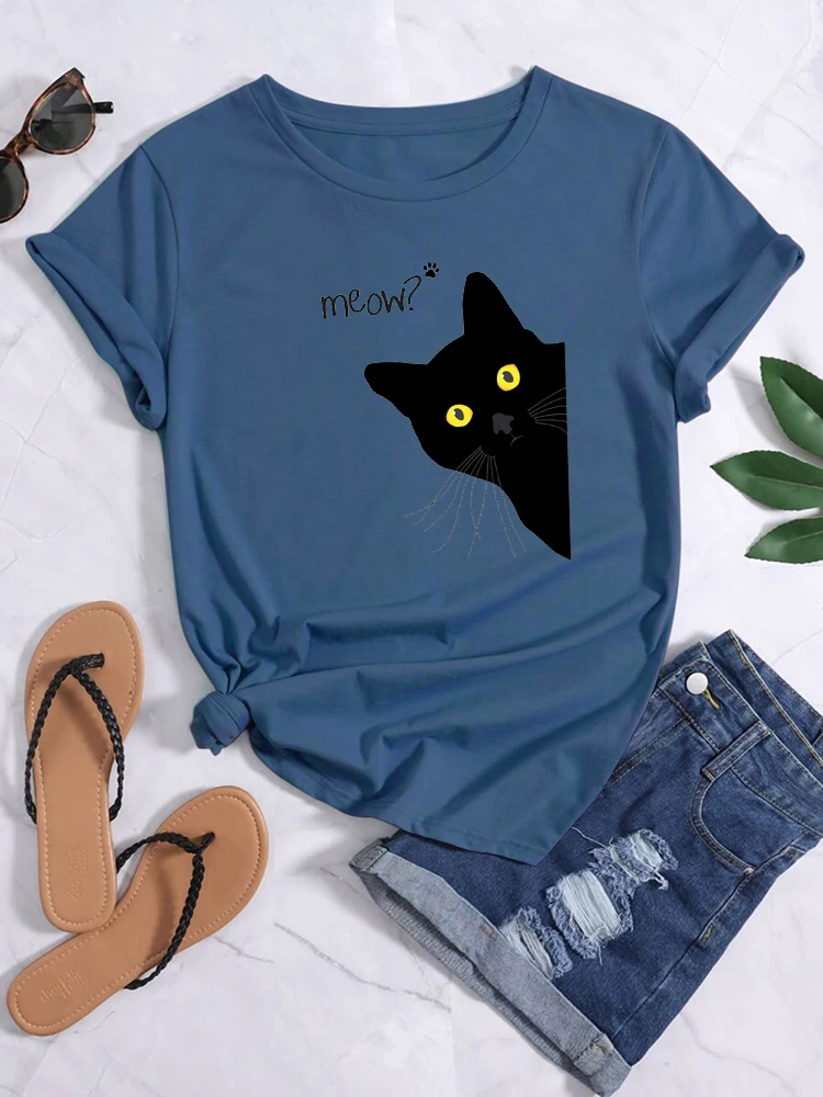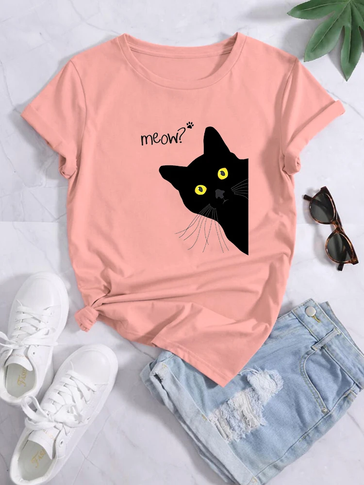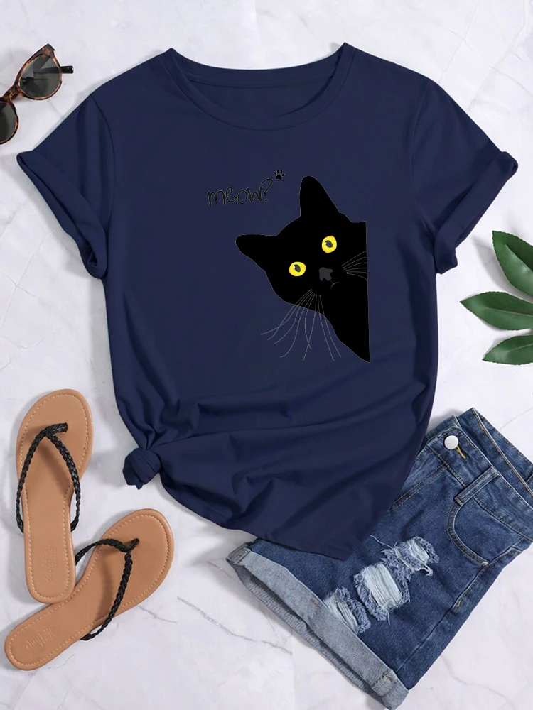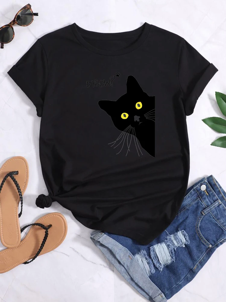 Футболка женская оверсайз с принтом милого мяу кота, Модная стильная повседневная футболка с круглым вырезом, черная, на весну-лето
