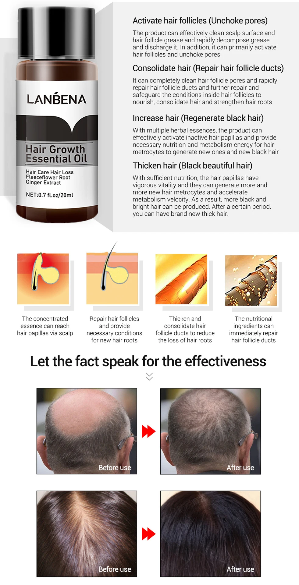 Эссенциальное масло для роста волос LANBENA, восстановление поврежд...