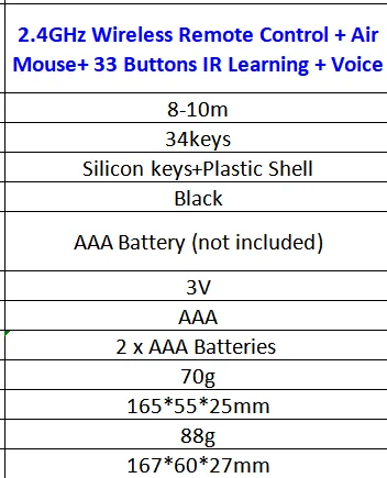 1. Голосовое управление: Нажмите кнопку голосового управления на пульте дистанционного управления для поиска канала, который вы хотите увидеть, прост и удобен в использовании. 2. Беспроводной: 2,4 ГГц Беспроводной соединение через usb-приемник, подключи и играй, вы можете боди с принтом «snuggle на диване и пользуются большой дальности Беспроводной контроль на расстоянии до 10 метров/32.8ft. 3. Встроенный 6-осевой гироскоп: этот воздушный пульт дистанционного управления Беспроводная мышь может ощущать изменение направления и скорости, так что вы можете перейти прямо в воздухе, чтобы контролировать его. 4. Удобный в использовании: 34 клавиши дистанционного использования мыши, легко контролировать громкость, страницу вверх/вниз, мышь использовать влево/вправо и т. Д. Просто сидеть на диване и наслаждаться. 5. Подходит для: Smart TV, Android TV box, mini PC, HTPC. Поддержка системы: Linux, Android 2.x, Android 4.x, Win 2000, Win vista, Win7 32, Win7 64, Win8 32, Win8 64, MAC OS X.