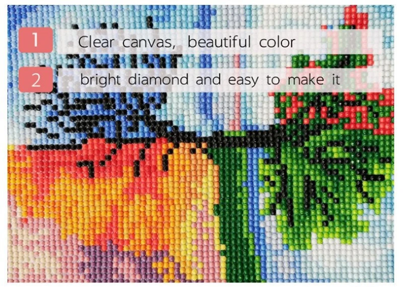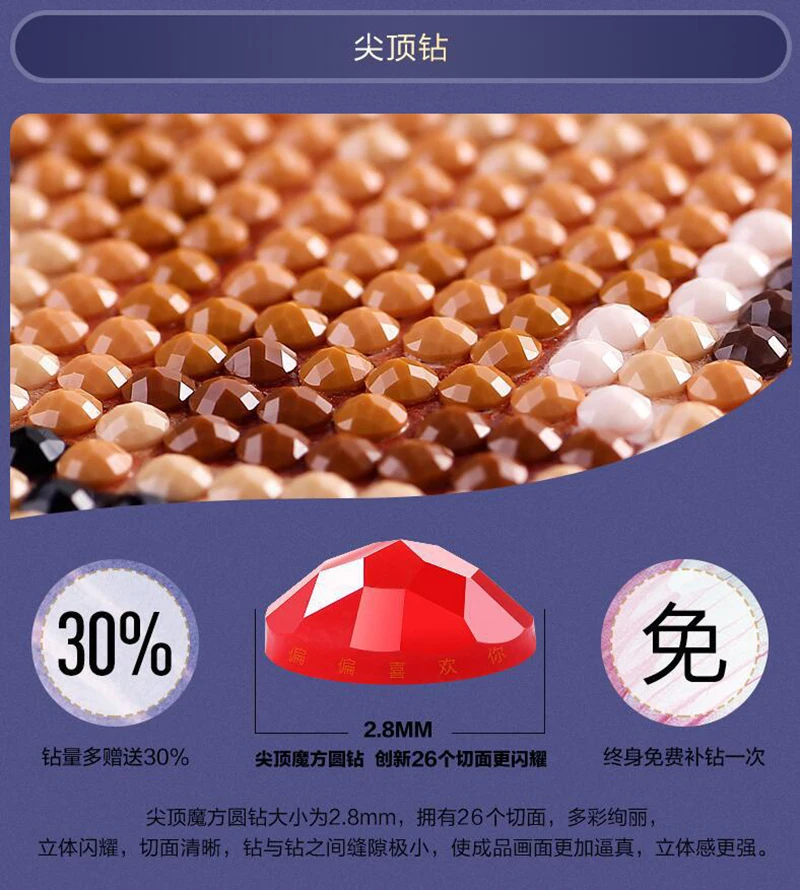 Этот продукт изготовлен из высококачественной смолы, которая является бесцветной. Диаметр каждой круглый дрель составляет около 2,8 мм, и все сверла обладает 26 лица. Яркий цвет, сильное трехмерное чувство. На 30% больше алмазов