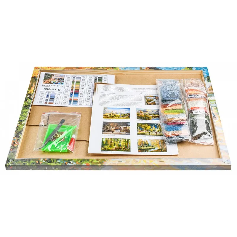 Основой картины служит холст, натянутый на подрамник. Для придания крепости конструкции подрамник дополнительно усилен листом оргалита. На холст нанесена цветная схема с контрастными условными обозначениями, схему покрывает высококачественный клеевой слой, сверху слой закрыт пленкой, которая предотвращает высыхание клея. Комплект квадратных акриловых камней расфасован по цветам в отдельные пакеты, на каждом пакете наклейка с номером цвета и условным обозначением.В набор так же входят специальный металлический пинцет и пластмассовый лоток для акриловых камней с низкими бортиками. Готовую картину можно закрепить на стене с помощью креплений, идущих в комплекте.