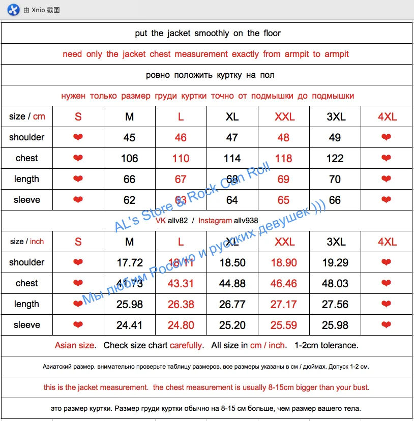 Пожалуйста, проверьте таблицу размеров и измерьте вашу куртку, как показано ниже.