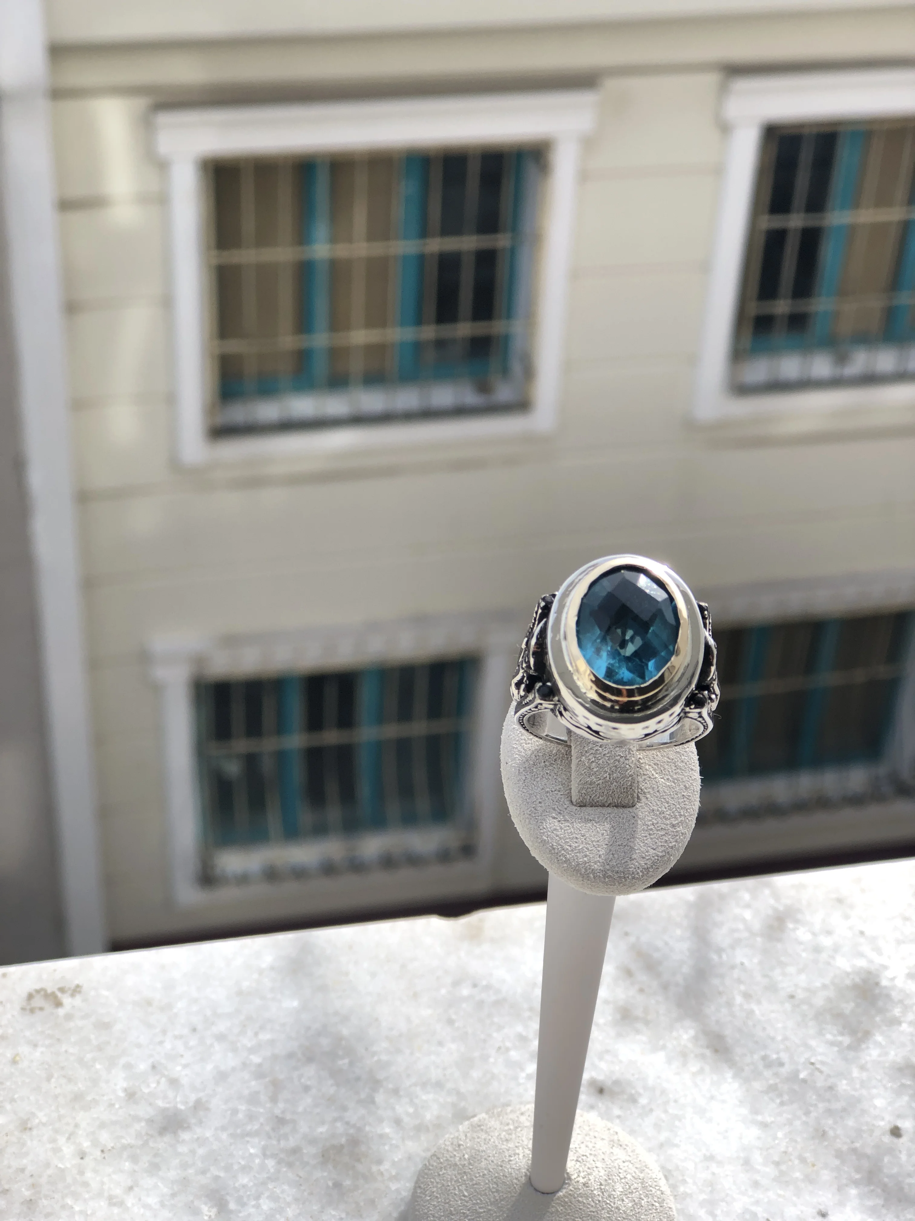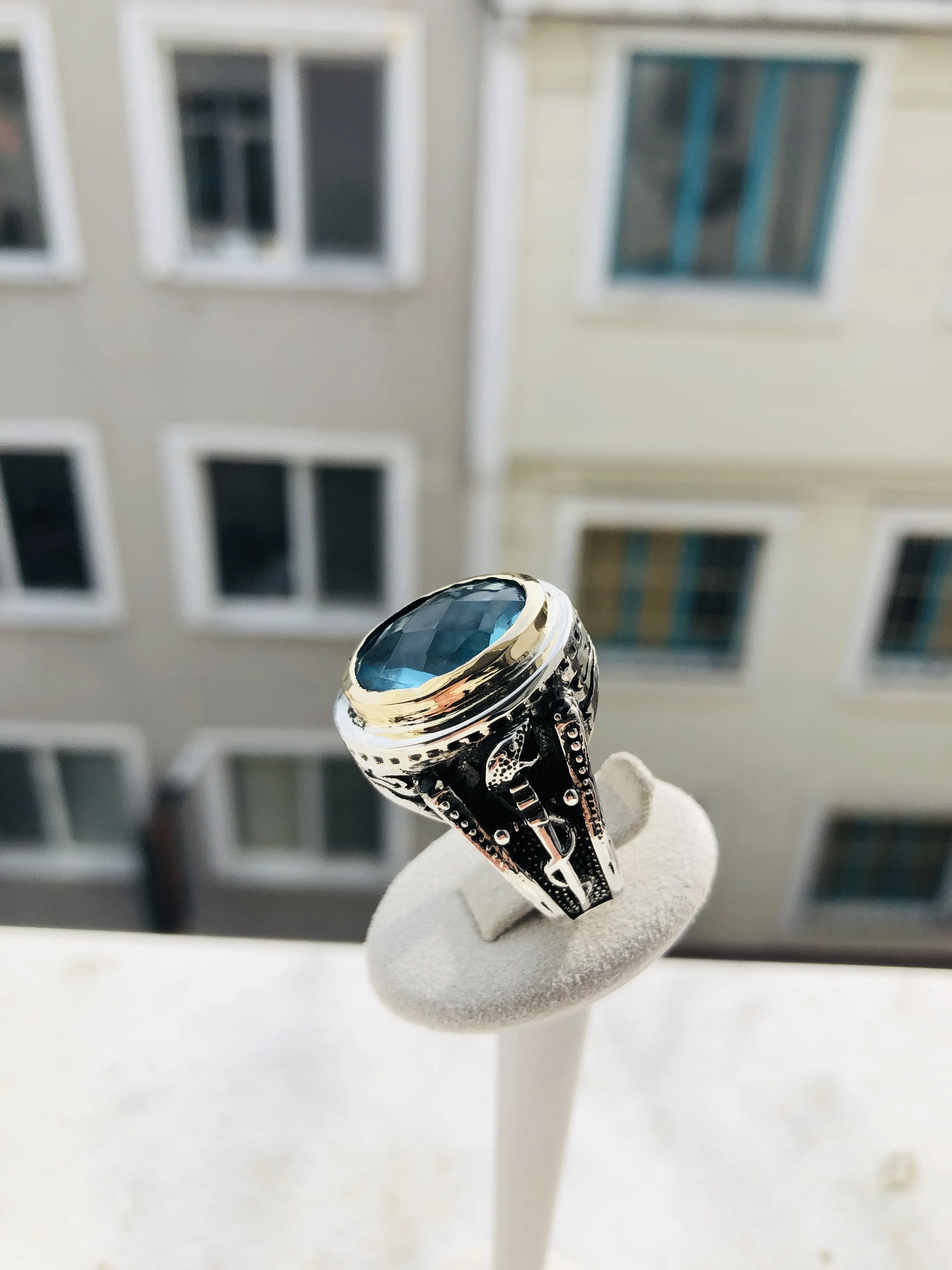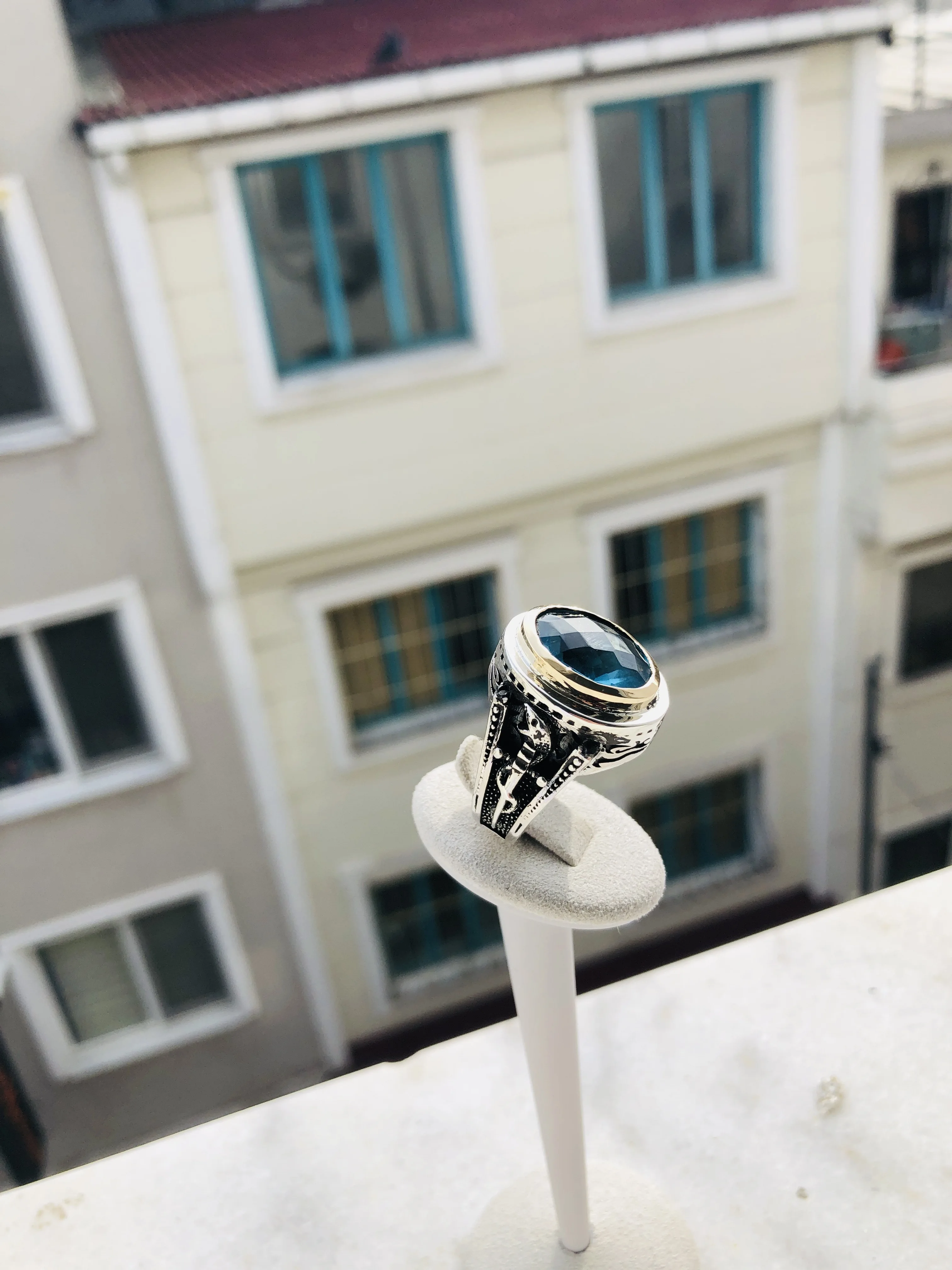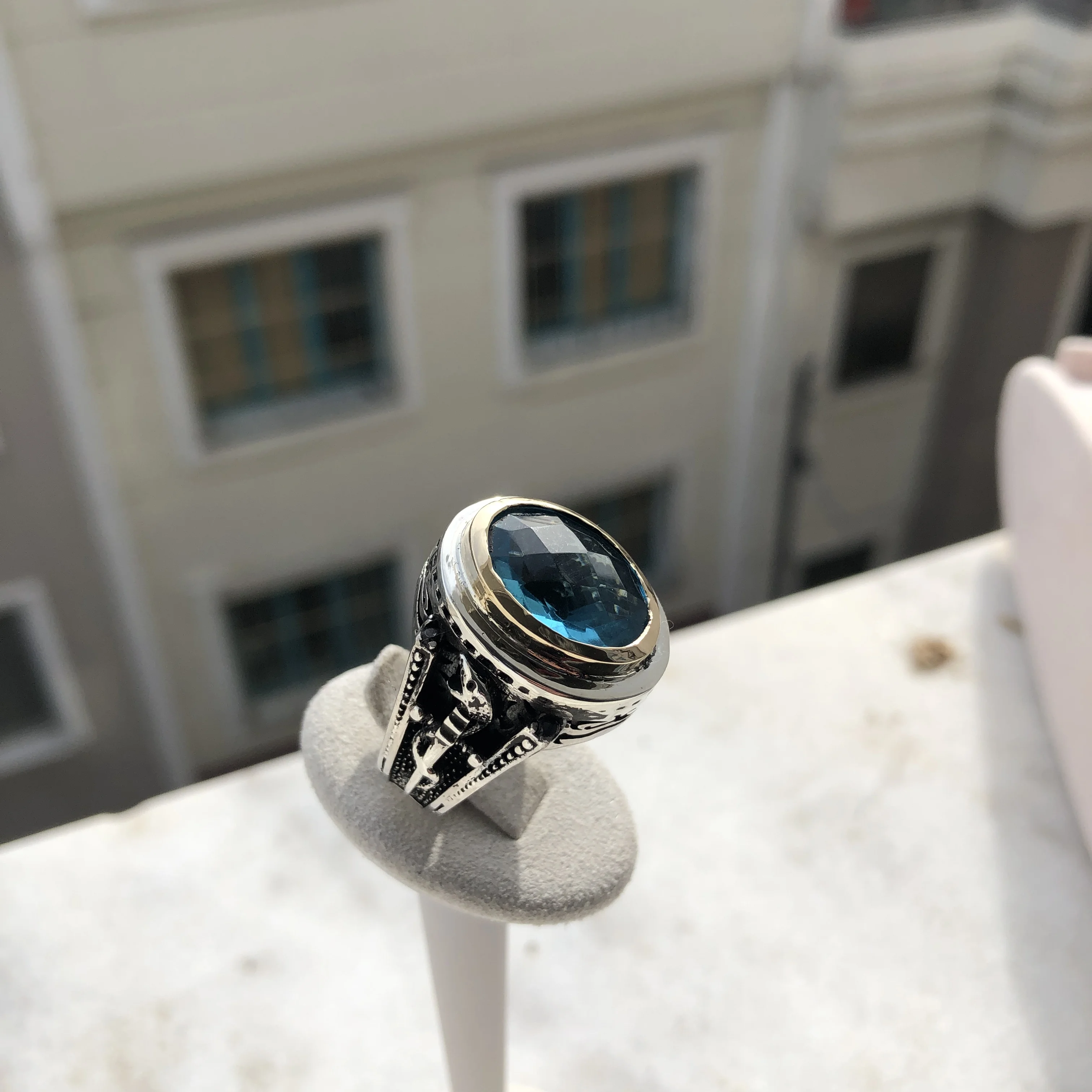 Кольцо мужское ручной работы с голубым топазом, Головой Дракона камень циркония чорный