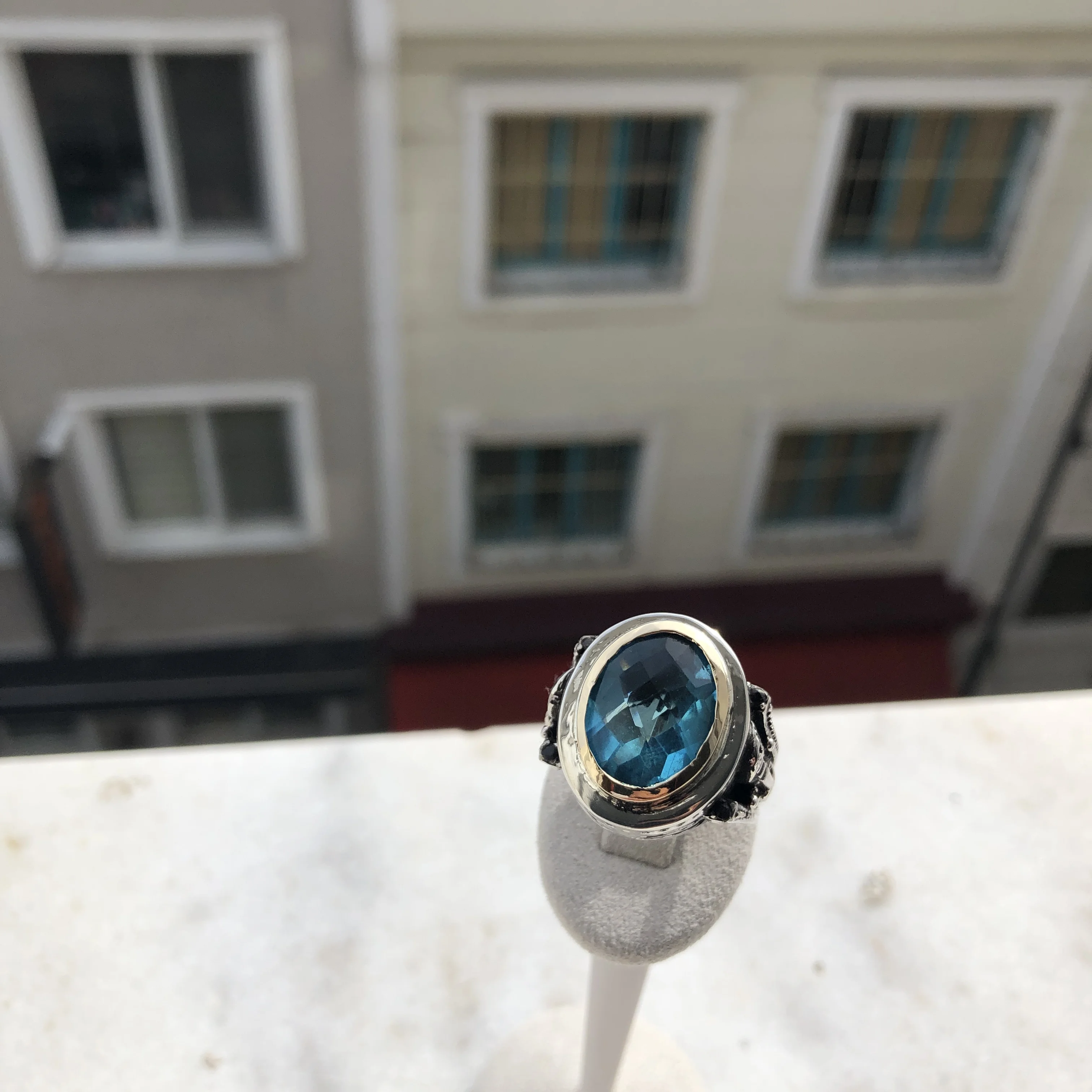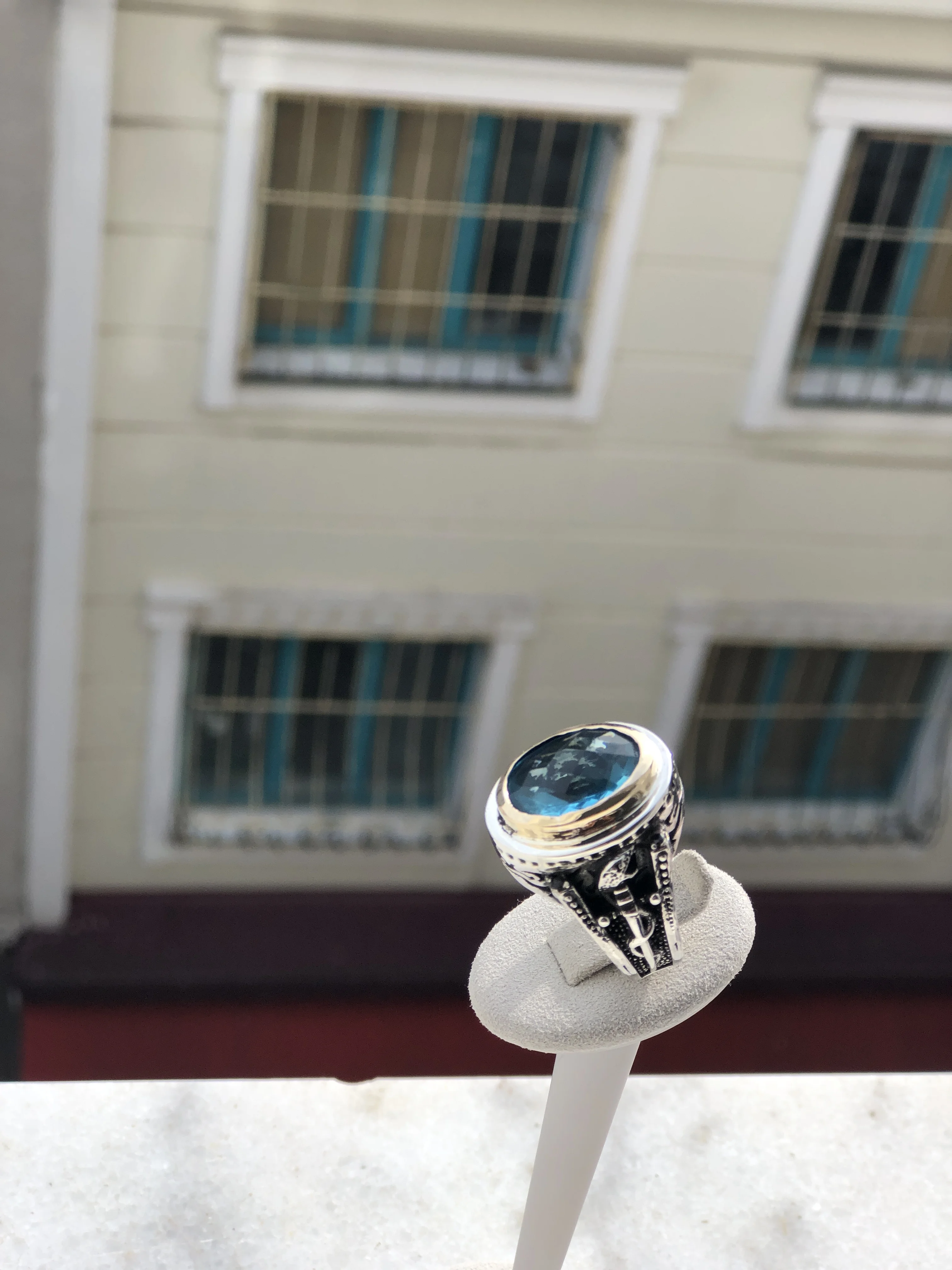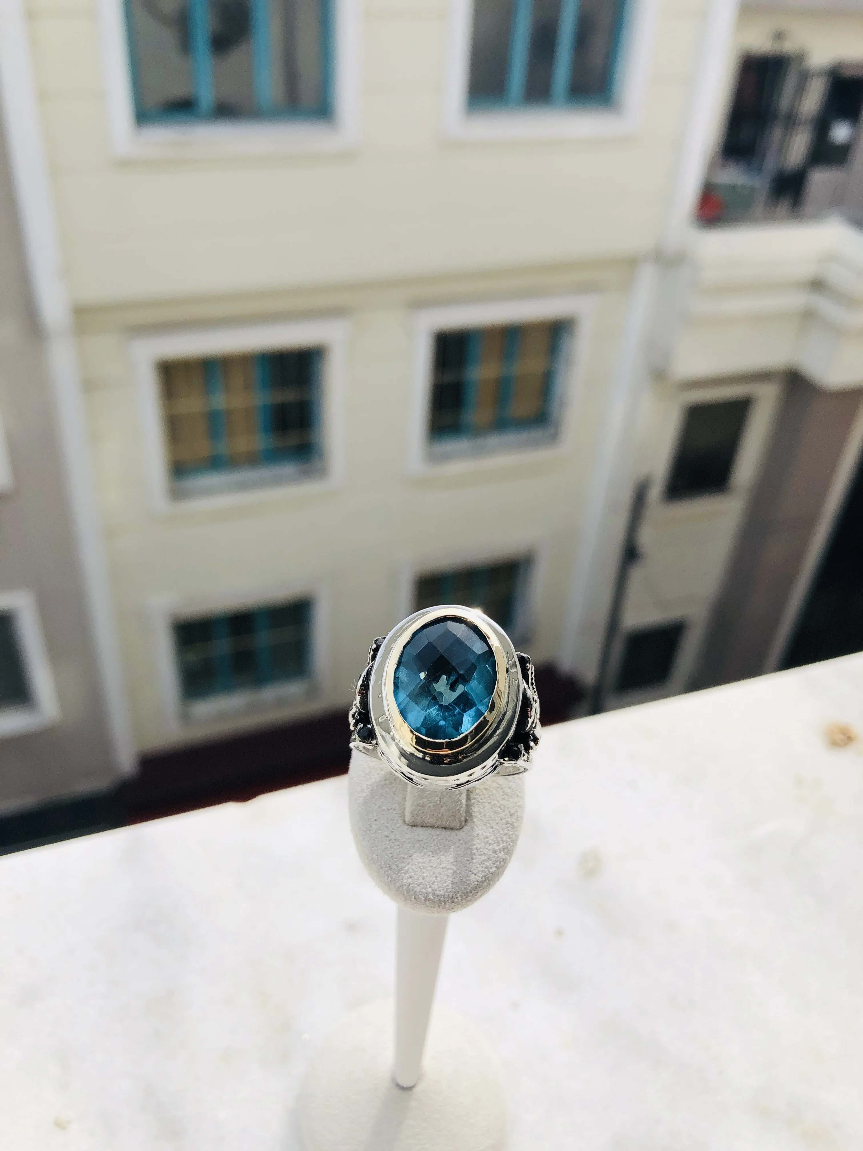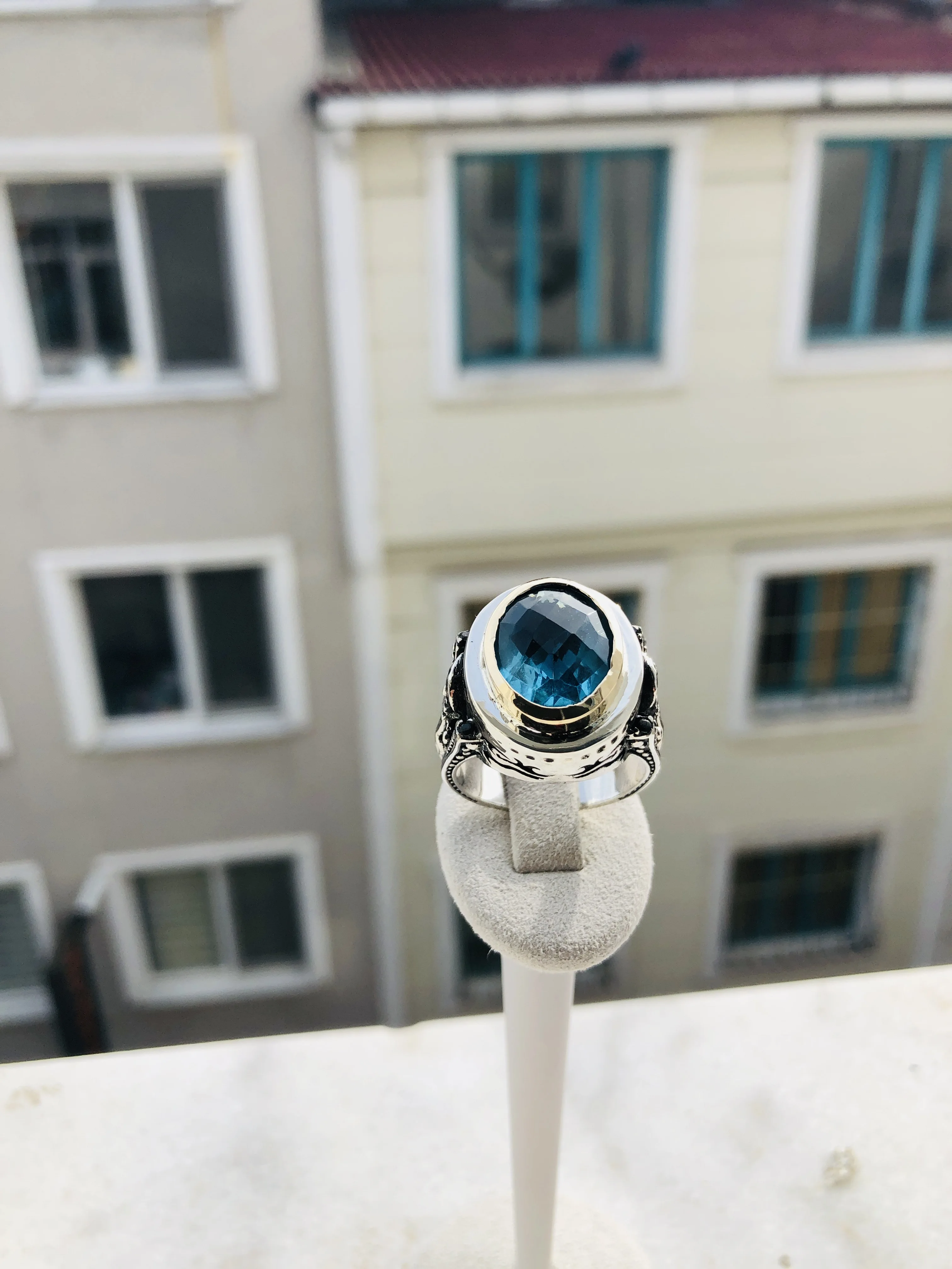 Кольцо мужское ручной работы с голубым топазом, Головой Дракона камень циркония чорный