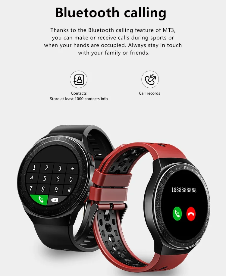 В этом продукте используется новый двойной чип Bluetooth со сверхнизким энергопотреблением, полноразмерный экран 1,28 дюйма, технология полного соответствия, экран высокой четкости, чрезвычайно плавный, 260 мАч, чистая емкость кобальтовая батарея, более длительный срок службы батареи, металлический корпус из цинкового сплава с вакуумным покрытием, более прочная и деликатная текстура. Часы поставляются с высокопроизводительным чипом памяти, который может хранить 1500 музыки. Благодаря технологии Bluetooth 4,0 и модулю динамиков AAC вы можете свободно наслаждаться музыкой на запястье, не подключая мобильный телефон, а также подключать Bluetooth-наушники и динамики Bluetooth по беспроводной сети. Исходящее оборудование. Звонок не находится под разговором, технология dual Bluetooth 4,0, умный микрофон с шумоподавлением, модуль динамика AAC, просто Подключитесь к Bluetooth мобильный телефон, вы можете ответить на часы, совершить звонок, адресную книгу с 1000 контактами также можно легко хранить. Посылка: 1 * умные часы MT3 1 * Руководство пользователя 1 * Розничная коробка (включая 1 * зарядный кабель)