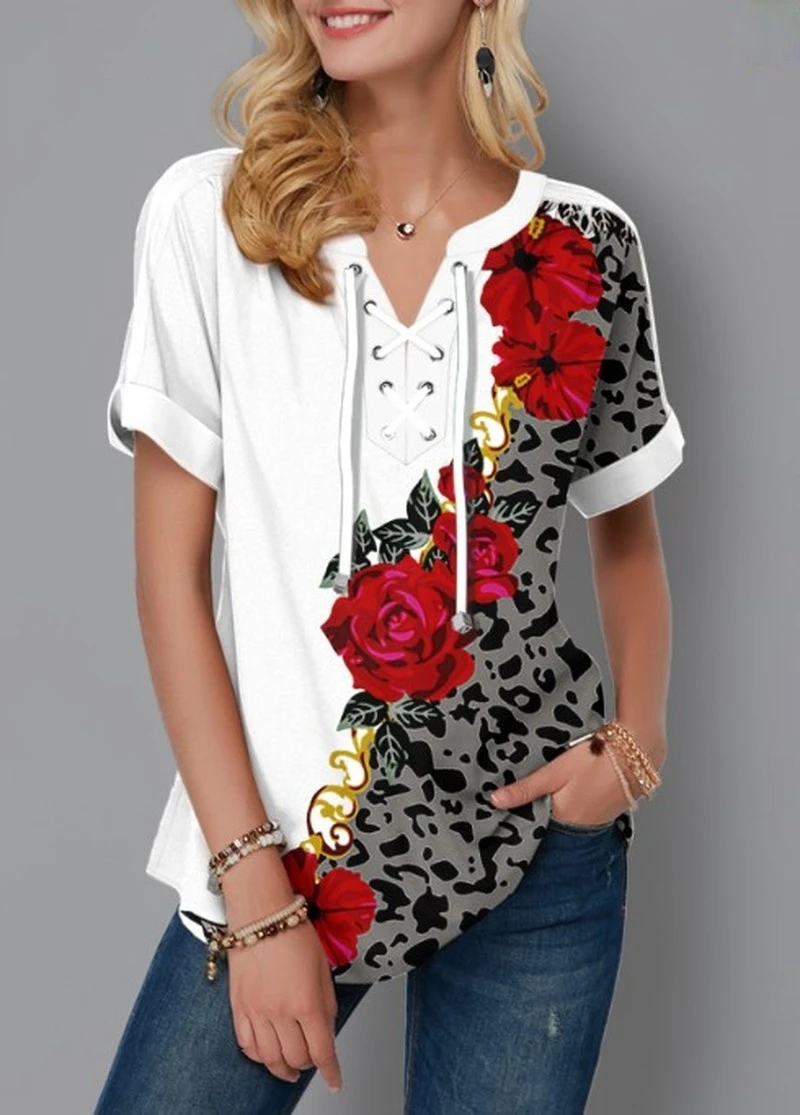 Женская футболка с коротким рукавом, летняя свободная футболка с цветочным принтом и V-образным вырезом